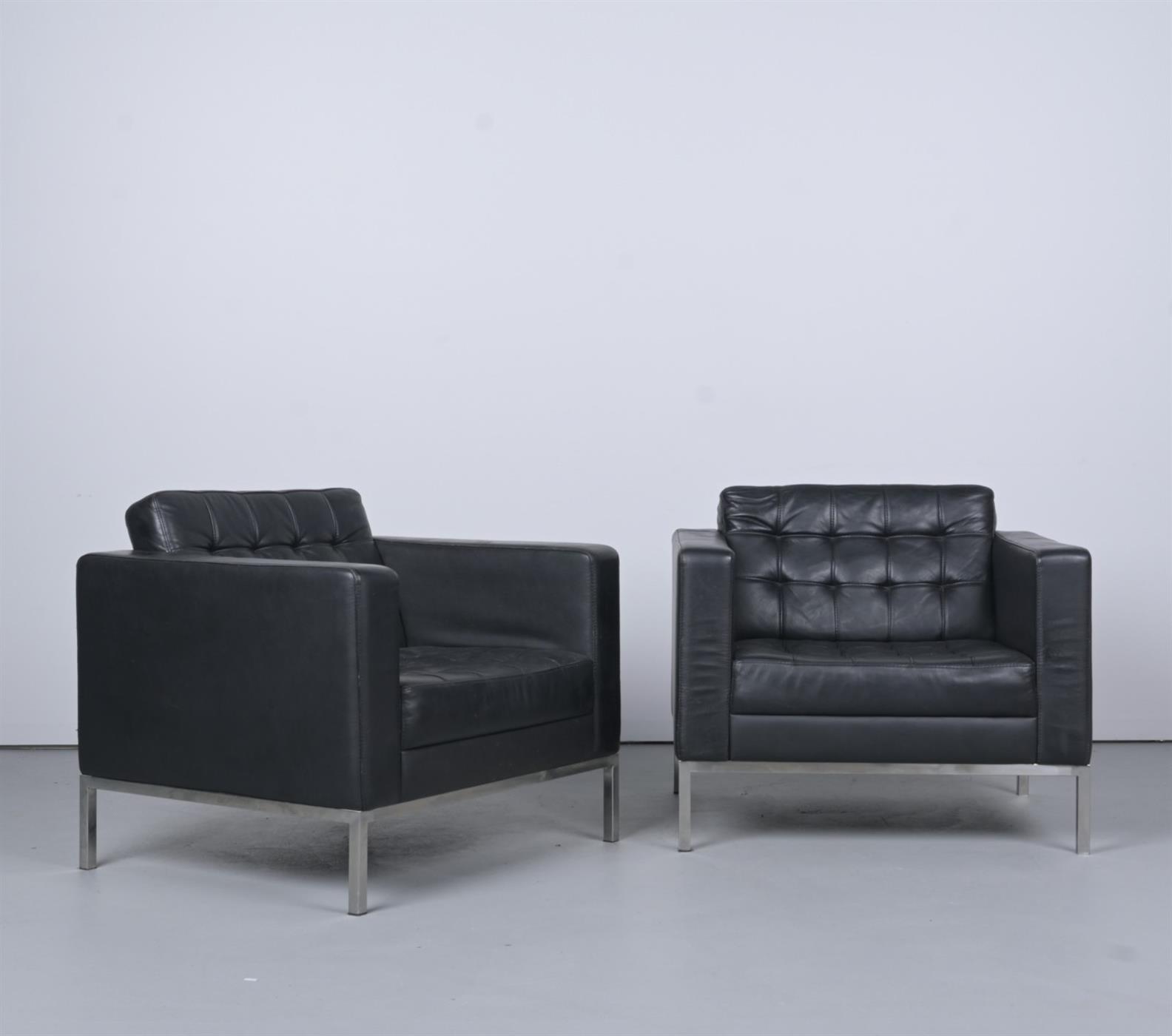 A PAIR OF BLACK LEATHER LOUNGE CHAIRS IN THE STYLE OF KNOLL