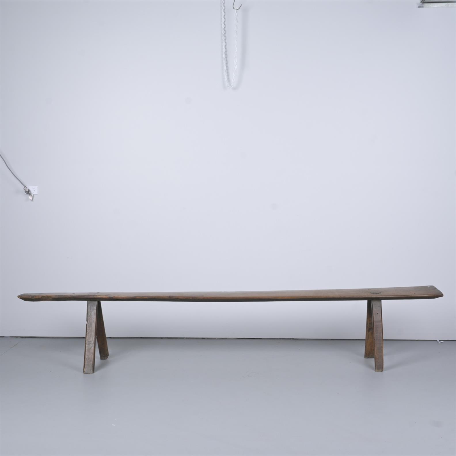 A VERY LONG GEORGE III ELM BENCH SEAT, THE TOP OF A SINGLE THICK PLANK, EARLY 19th CENTURY (57CM H X 313CM W X 28CM D)
