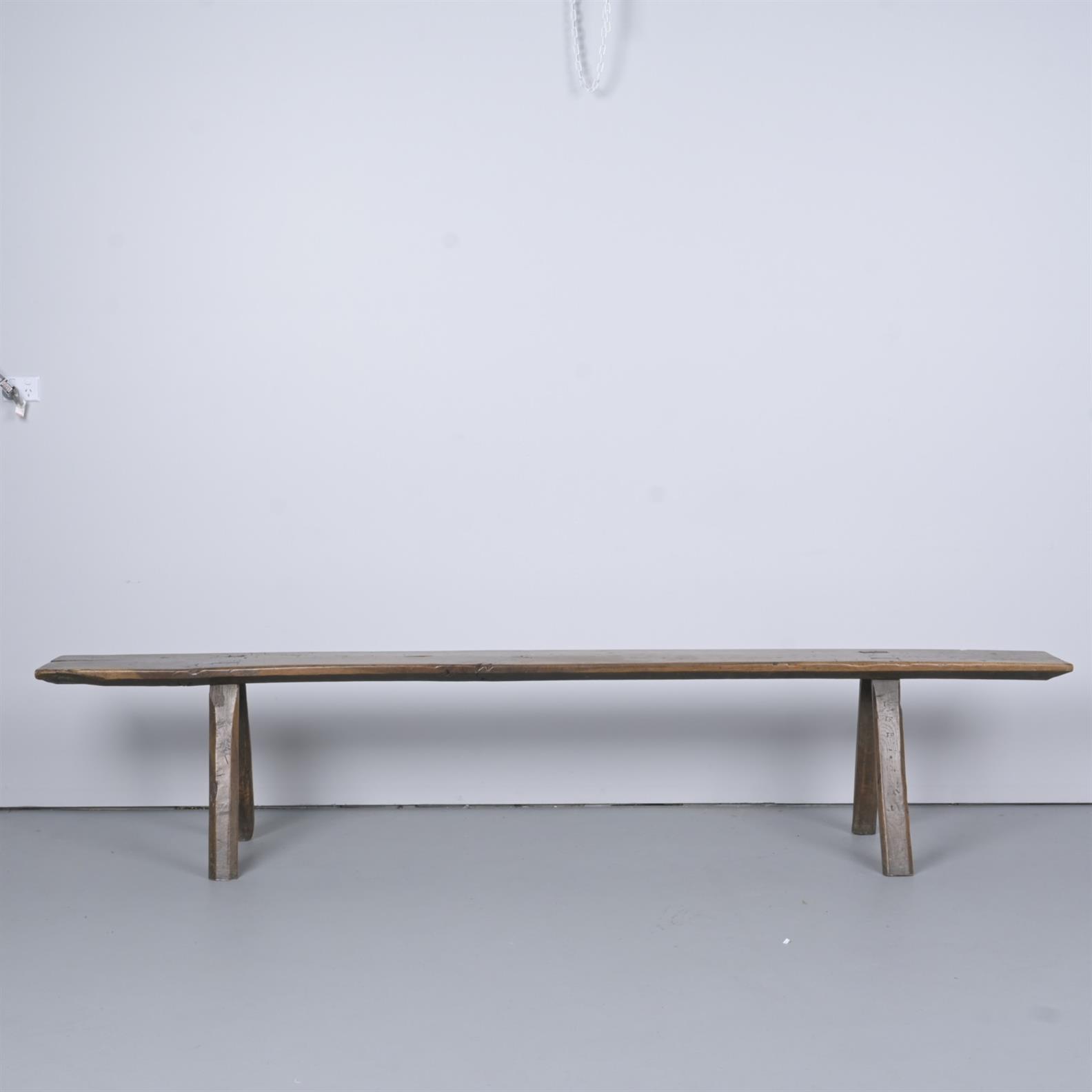 A VERY LONG GEORGE III ELM BENCH SEAT, THE TOP OF A SINGLE THICK PLANK, EARLY 19th CENTURY (55CM H X 277CM W X 52CM D)