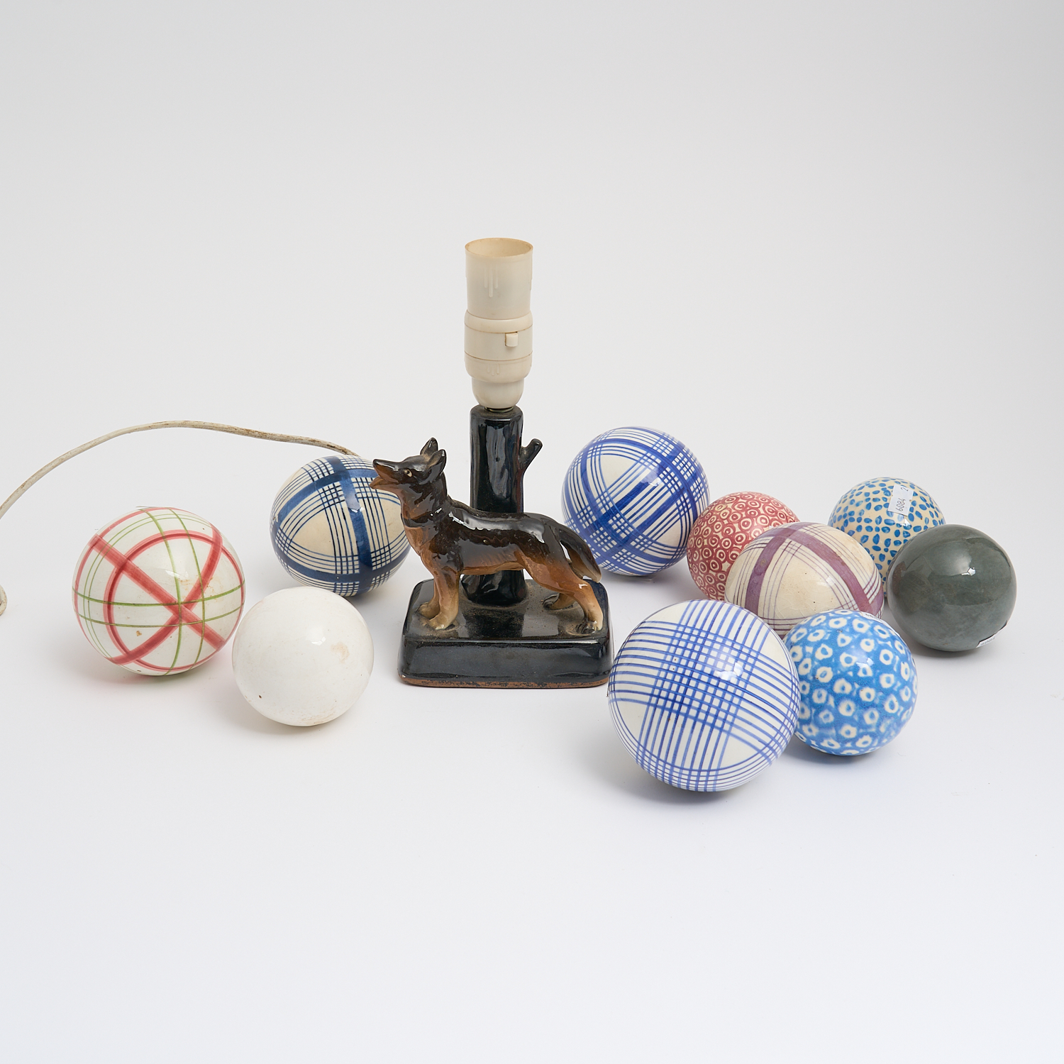 A FIGURAL CERAMIC DOG LAMP TOGETHER WITH A COLLECTION OF PORCELAIN PATTERNED CARPET BOWLS H.22CM (LAMP)