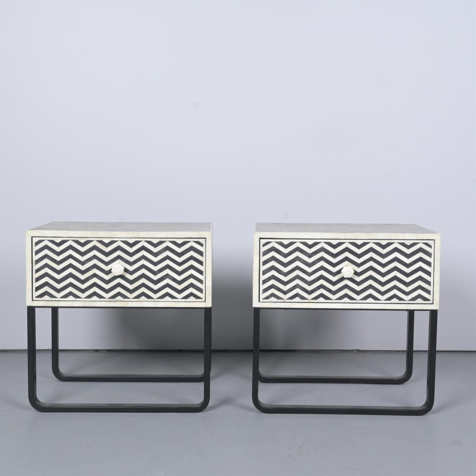 A PAIR OF CONTEMPORARY BONE INLAID BEDSIDE TABLES (60CM H X 60CM W X 45CM D)
