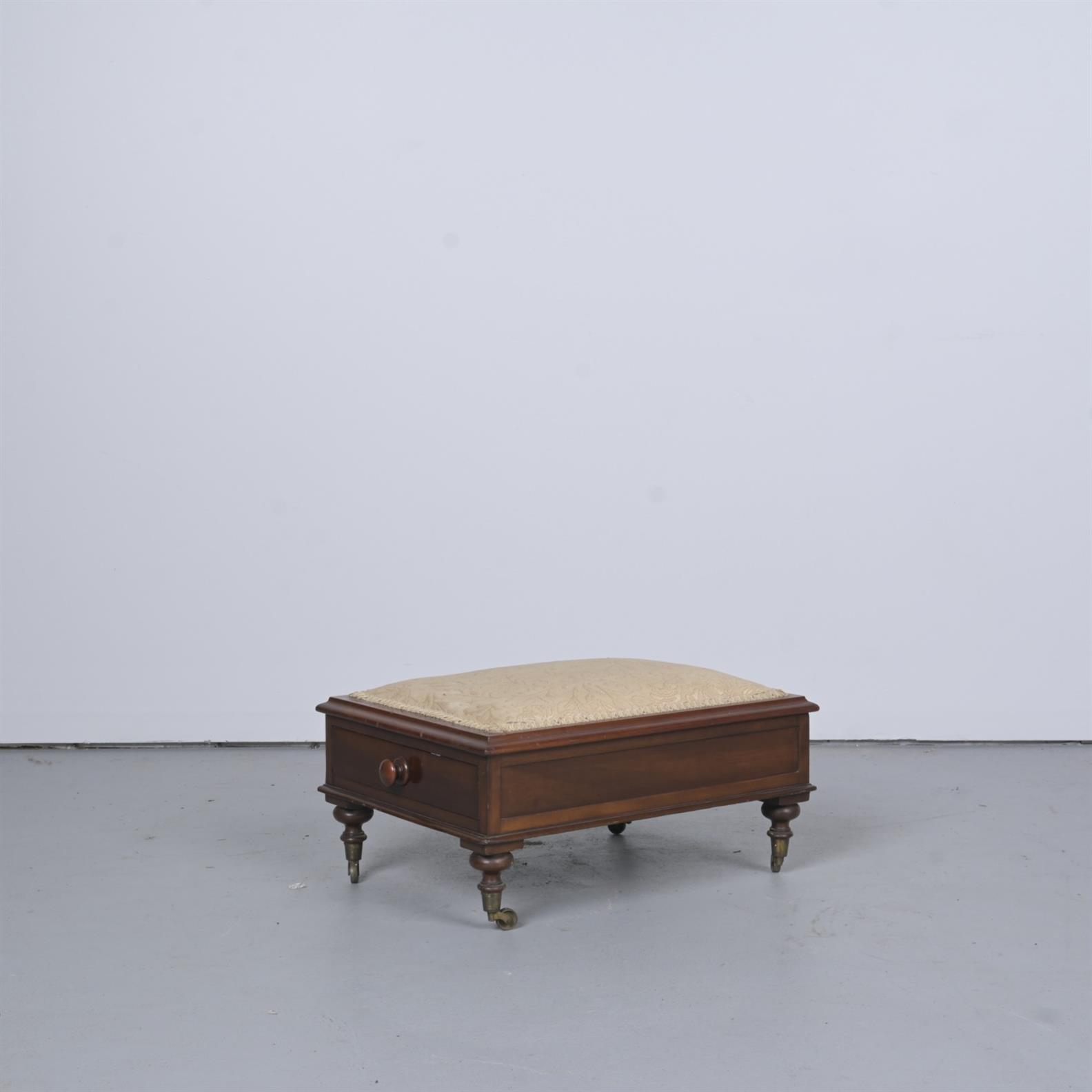 A VICTORIAN AUSTRALIAN CEDAR LOW STOOL, WTH A PADDED TOP ABOVE A DRAWER TO ONE SIDE (28CM H X 57CM W X 42CM D)