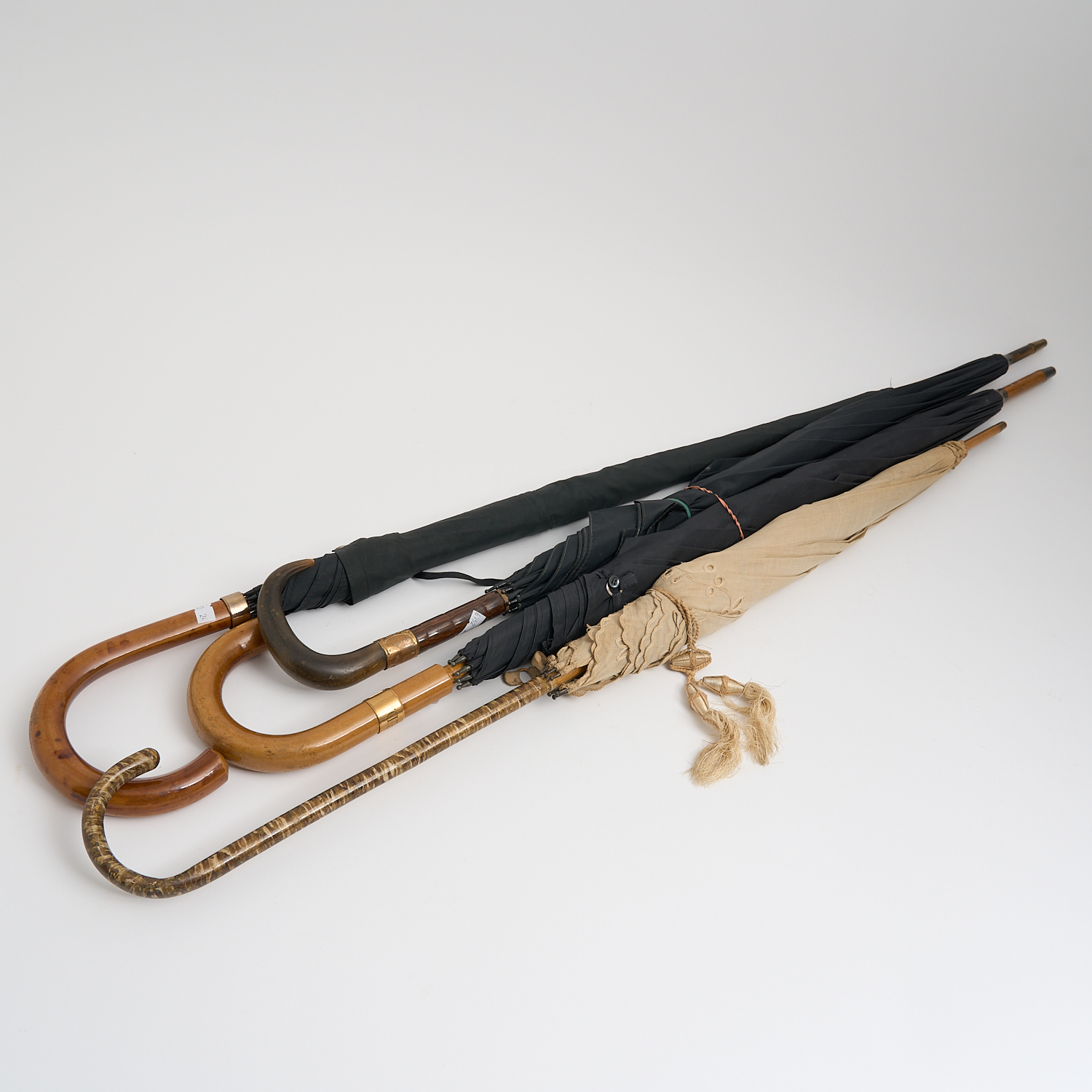 A COLLECTION OF FOUR PARASOLS INCLUDING ONE WITH A HORN HANDLE L.94CM (LONGEST)