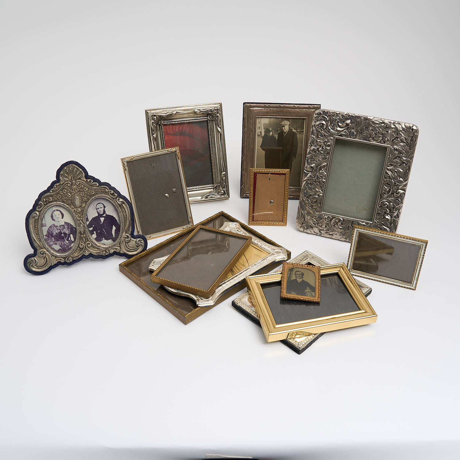 A LARGE COLLECTION OF PHOTO FRAMES INCLUDING ONE STERLING SILVER TOGETHER WITH VARIOUS ANTIQUE BRASS AND METAL FRAMES AND A DAGUERREOTYPE 17.5 X 13CM (LARGEST)