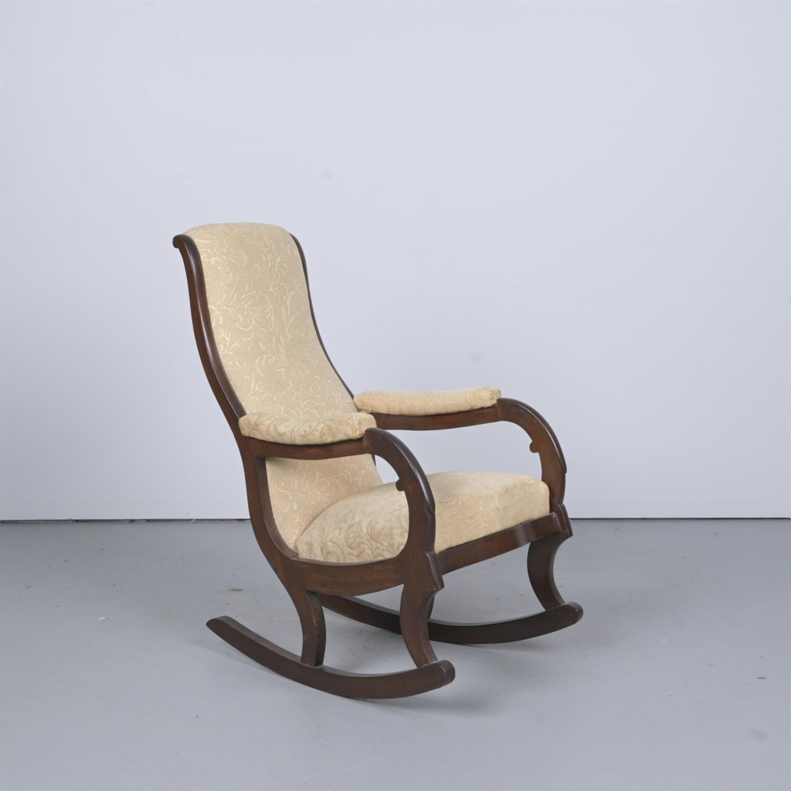 A LATE VICTORIAN MAHOGANY AND UPHOLSTERED ROCKING CHAIR (103CM H X 58CM W)