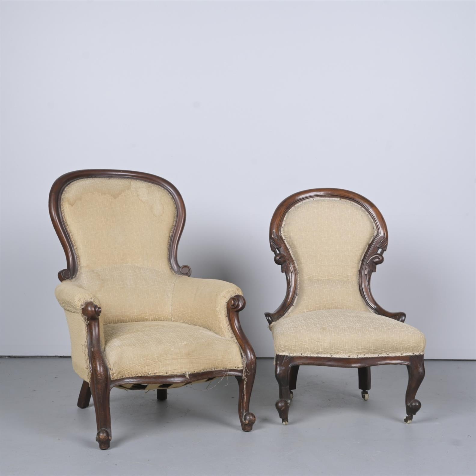 A VICTORIAN WALNUT AND UPHOLSTERED ARMCHAIR WITH A LADY'S CHAIR OF MATCHING TYPE