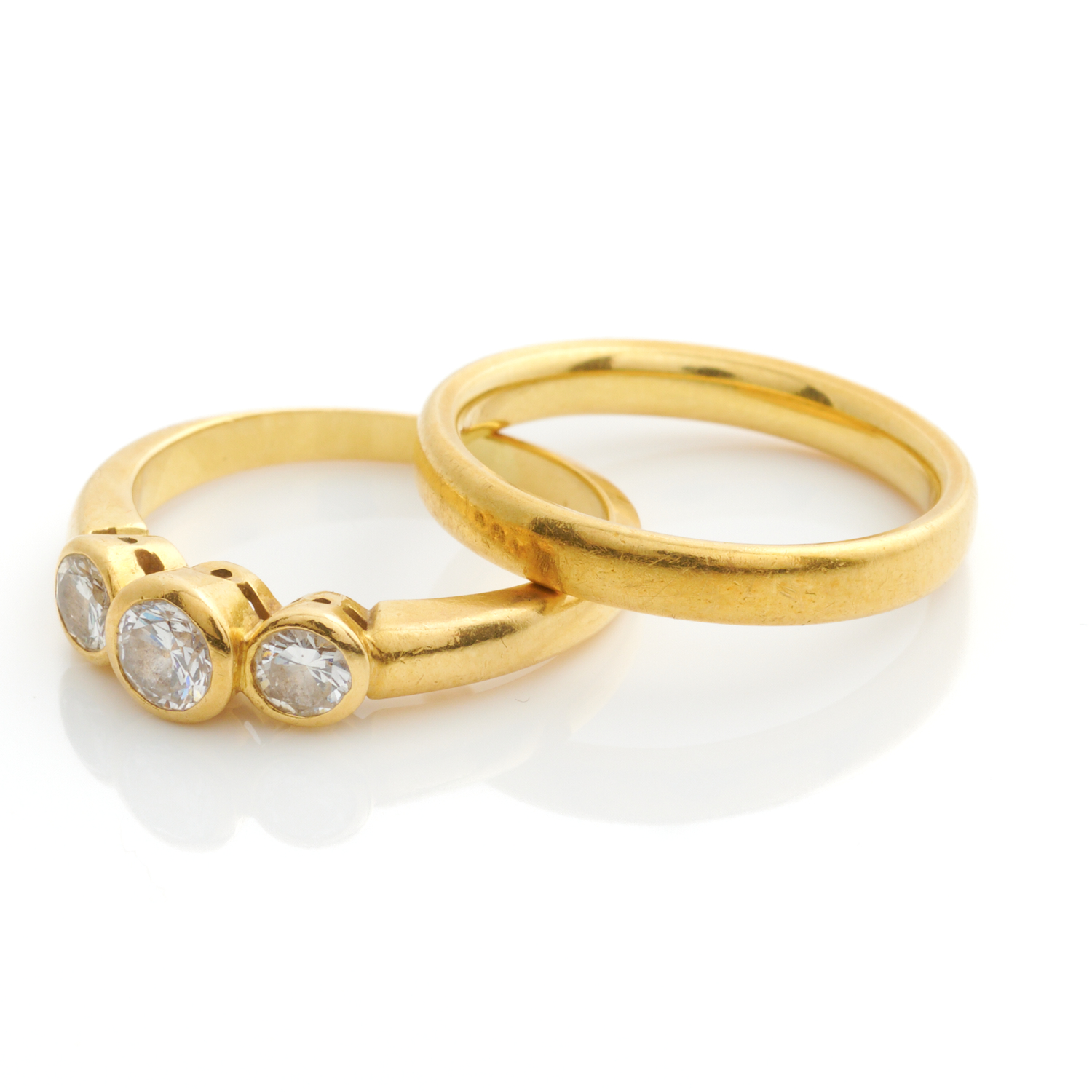 A RING SUITE IN 18CT GOLD, COMPRISING OF A THREE STONE DIAMOND BAND, THE CENTRAL DIAMOND WEIGHING APPROXIMATELY 0.20CTS, SIZE K, TOGETHER WITH A BAND, SIZE L, TOTAL WEIGHT 7.3GMS