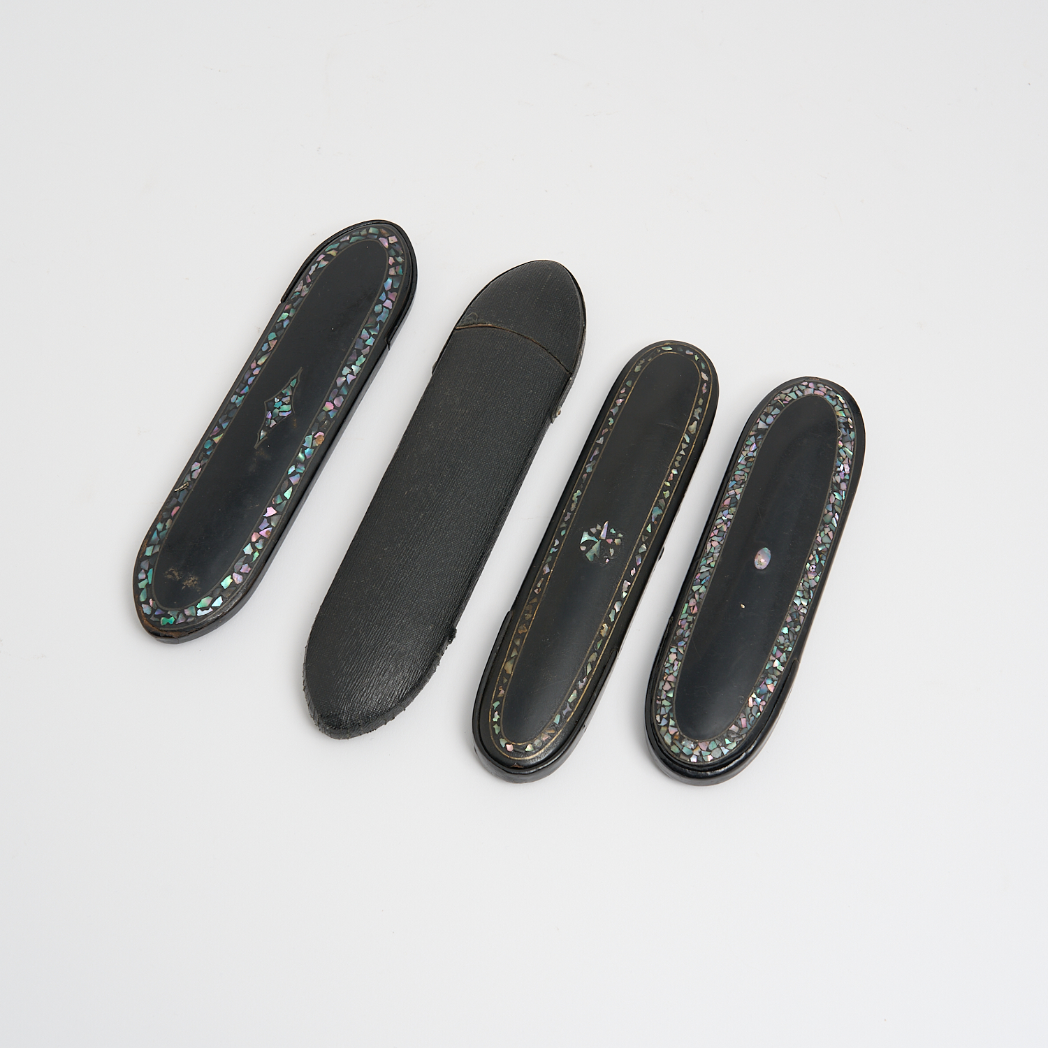 A COLLECTION OF FOUR MID-19TH CENTURY SPECTACLE CASES INCLUDING THREE INLAID WITH MOTHER-OF-PEARL L.18CM (LONGEST)
