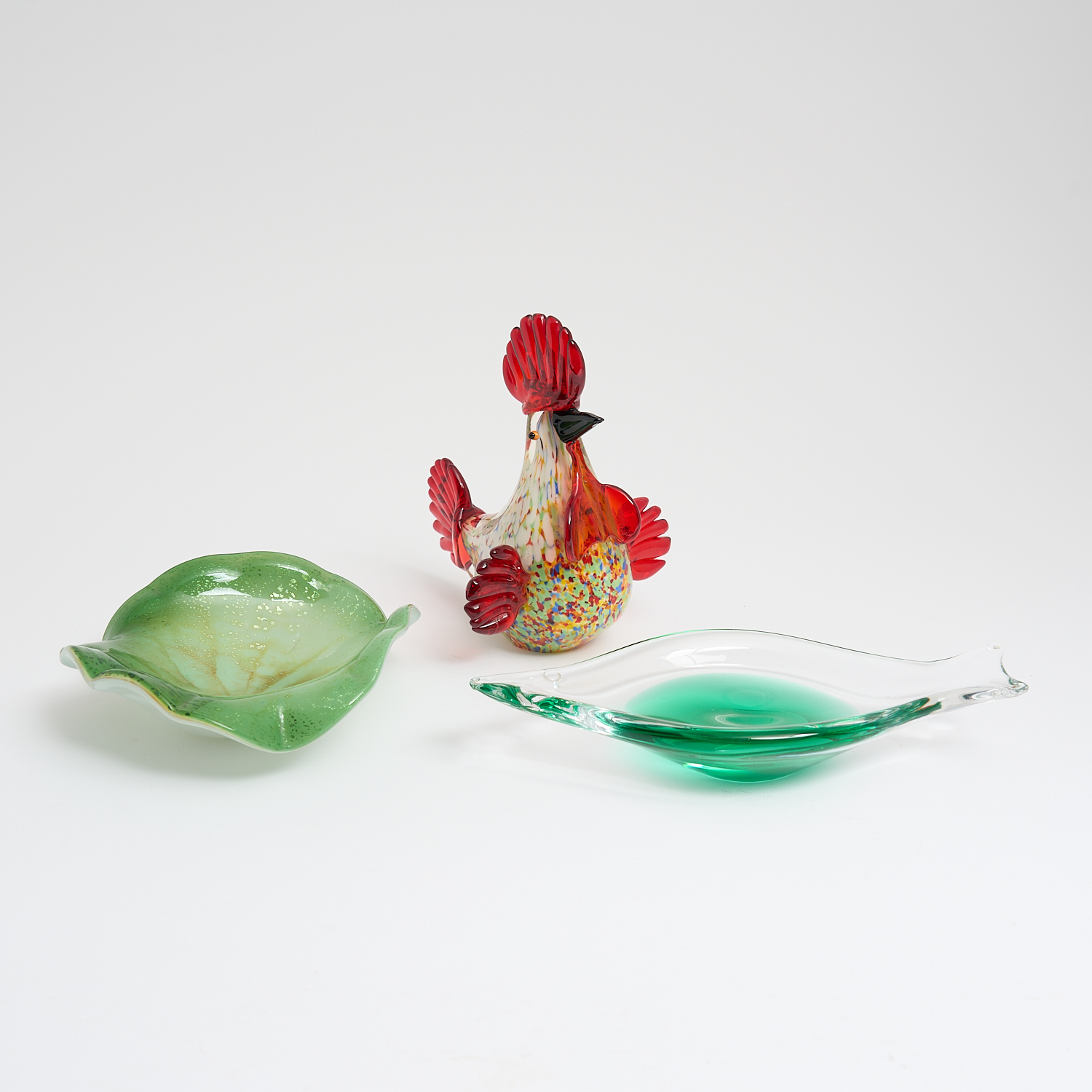 THREE PIECES OF MURANO GLASS INCLUDING A ROOSTER, AND LEAF AND FISH-FORM DISHES H.16.5CM (TALLEST)