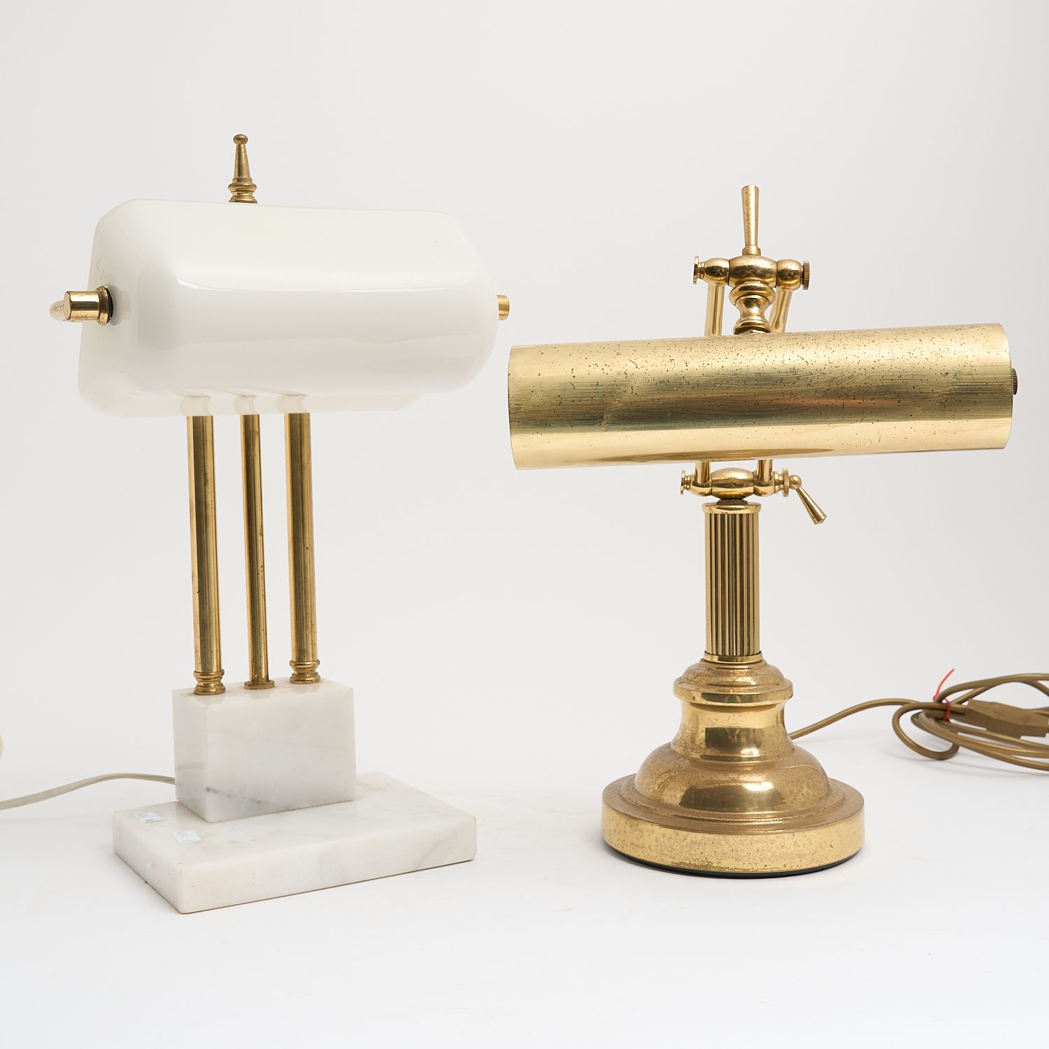 TWO LAMPS INCLUDING A MARBLE AND BRASS TABLE LAMP AND A BRASS DESK LAMP (A/F) H.42CM (TALLEST)