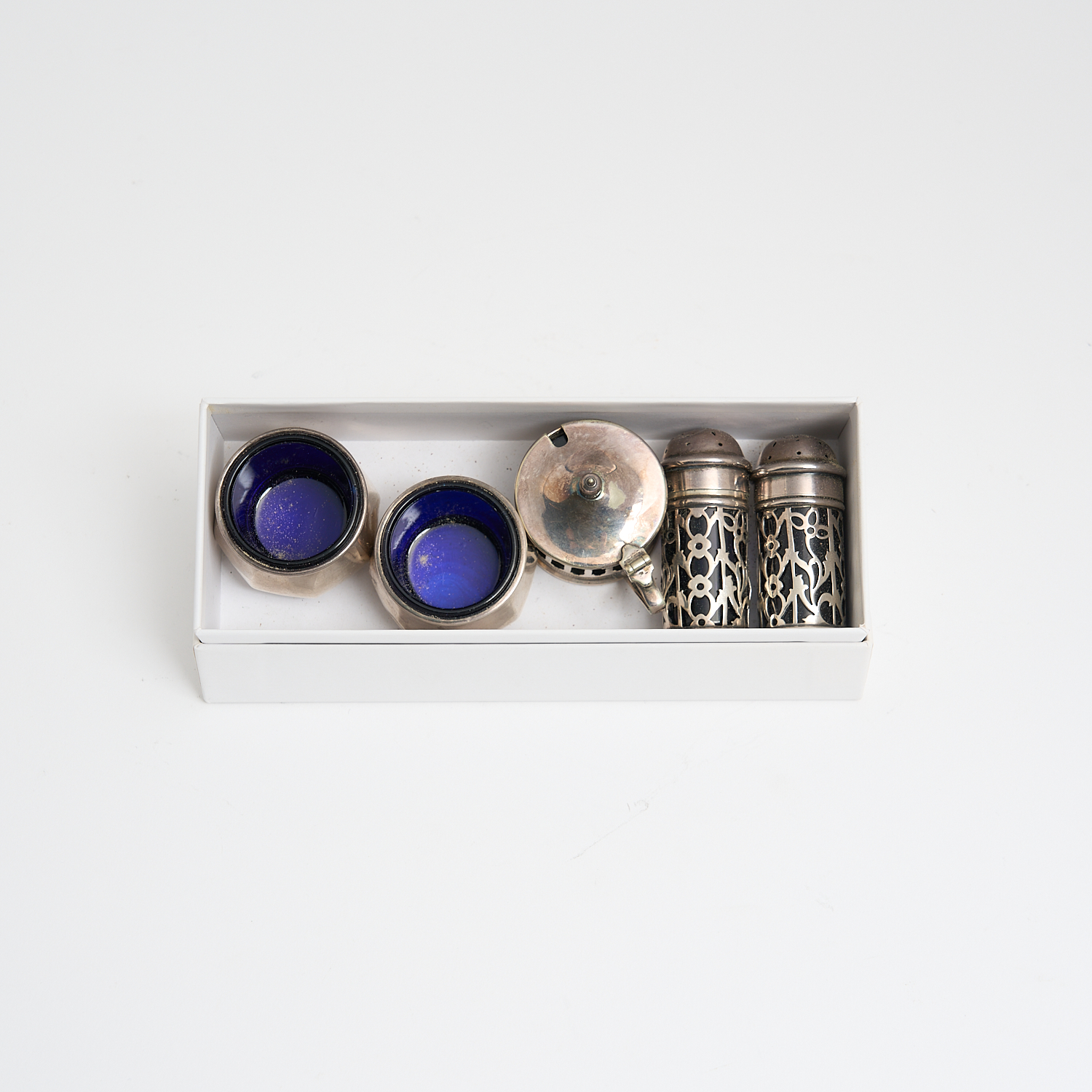 A STERLING SILVER TABLE SET OF SHAKERS AND SALTS WITH BLUE GLASS LINERS