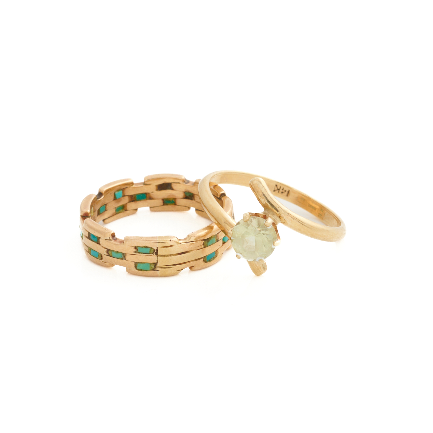 A PAIR OF RINGS IN 14CT GOLD, ONE TURQUOISE BAND, SIZE K 1/2, TOGETHER WITH A PASTE RING, SIZE M, TOTALLING 6.1GMS