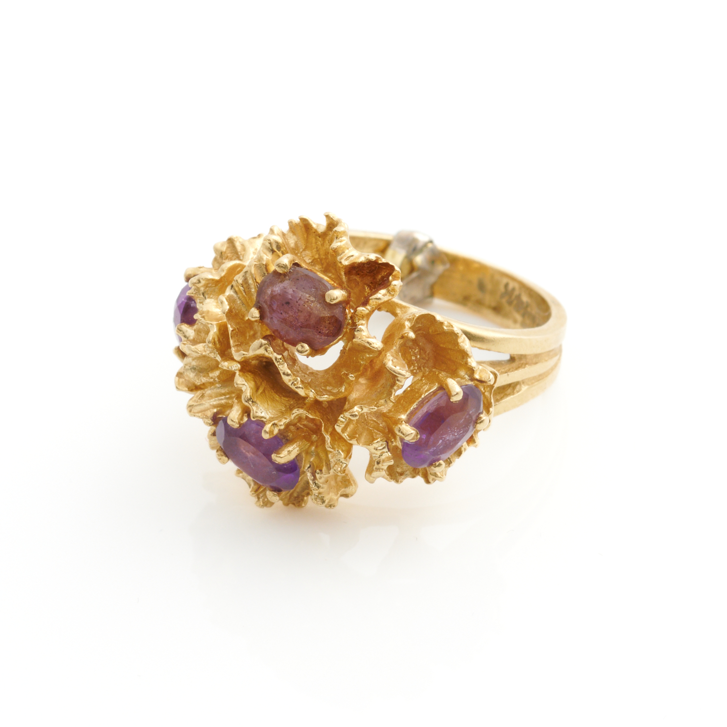 A FREE FORM AMETHYST CLUSTER RING IN 14CT GOLD, SIZE L 1/2, 10.5GMS