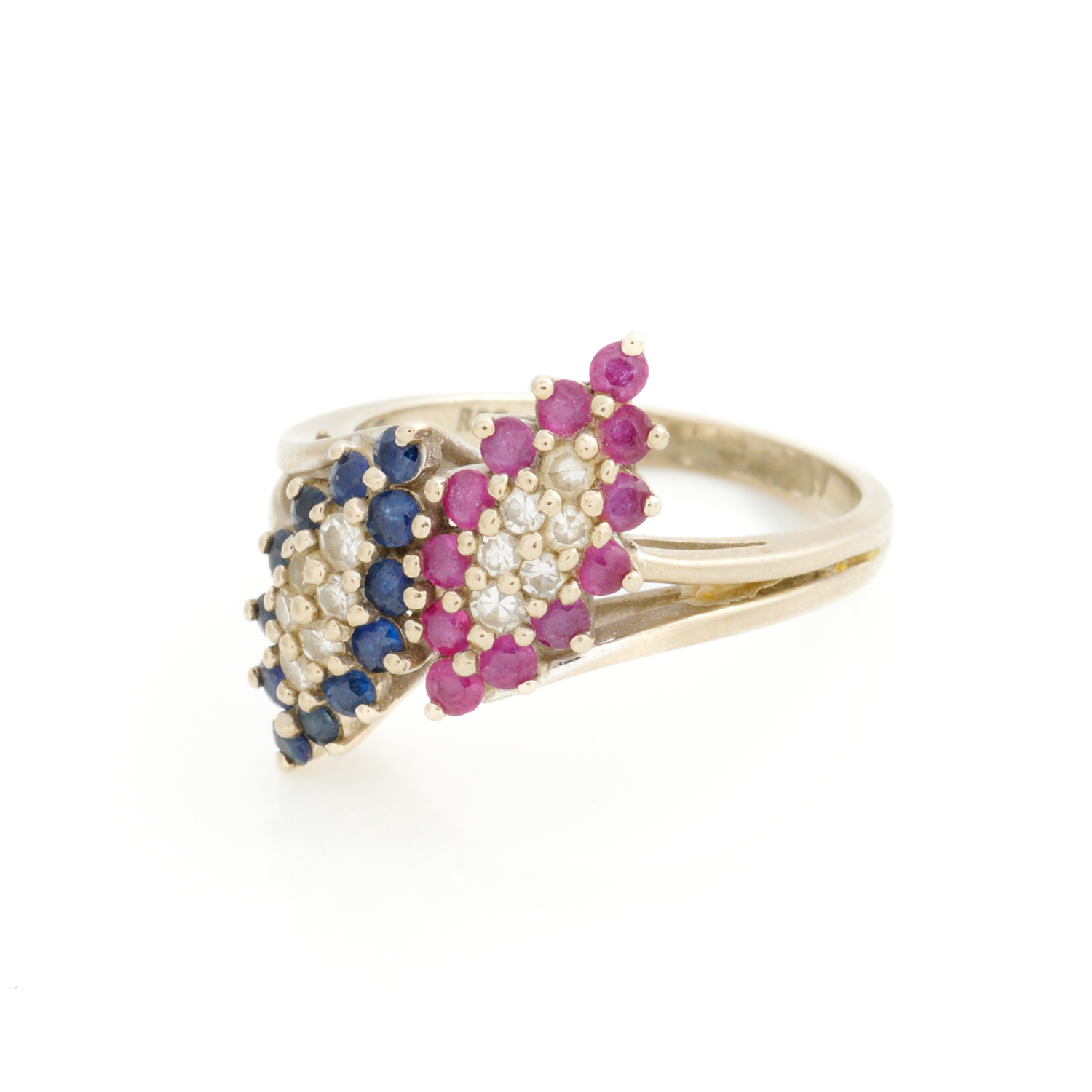 A RUBY, SAPPHIRE AND DIAMOND RING IN 14CT WHITE GOLD, SIZE N, 4.1GMS