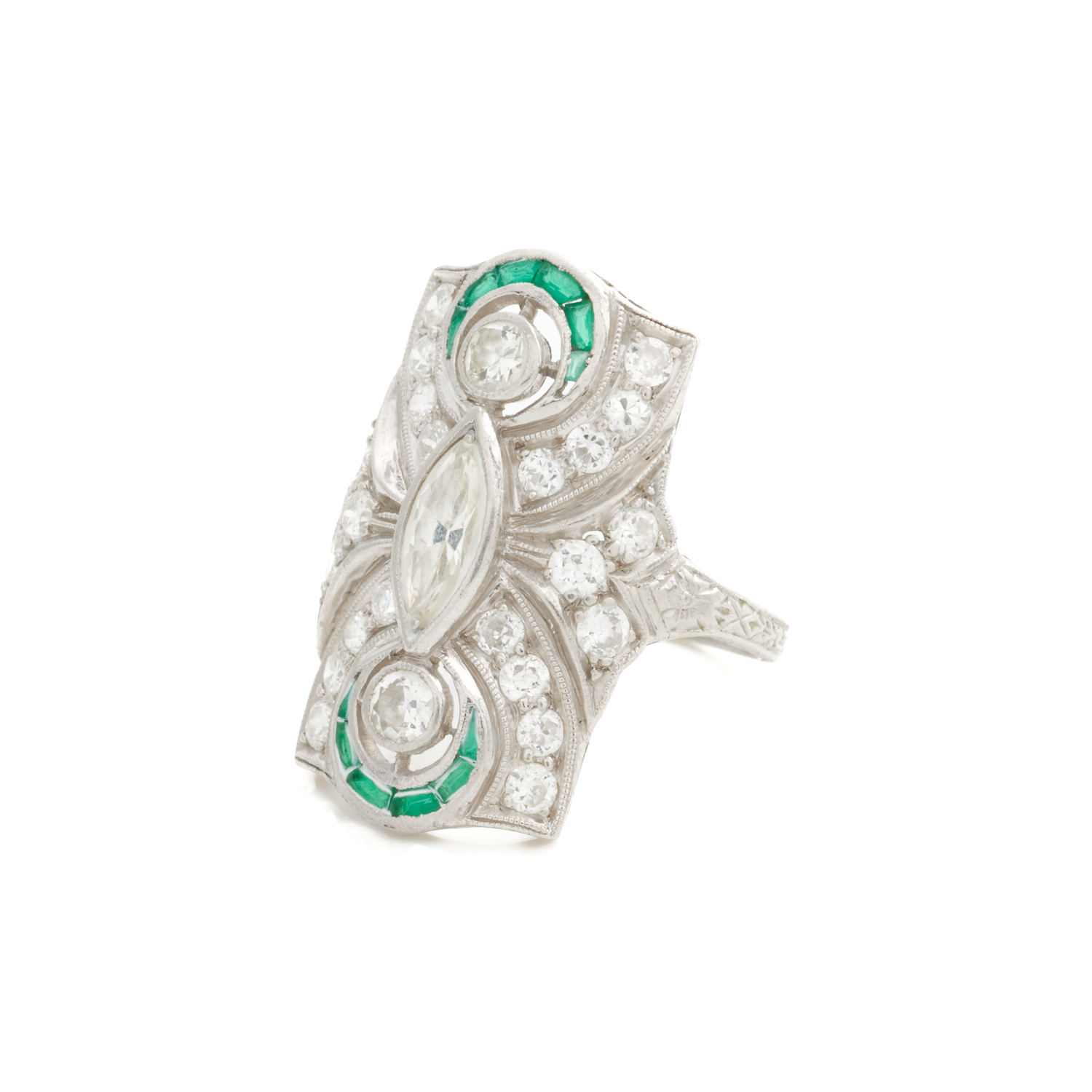 AN ART DECO DIAMOND AND EMERALD PLAQUE RING IN PLATINUM, THE CENTRAL MARQUISE CUT DIAMOND WEIGHING APPROXIMATELY 0.40CTS, SIZE N, 6.10GMS