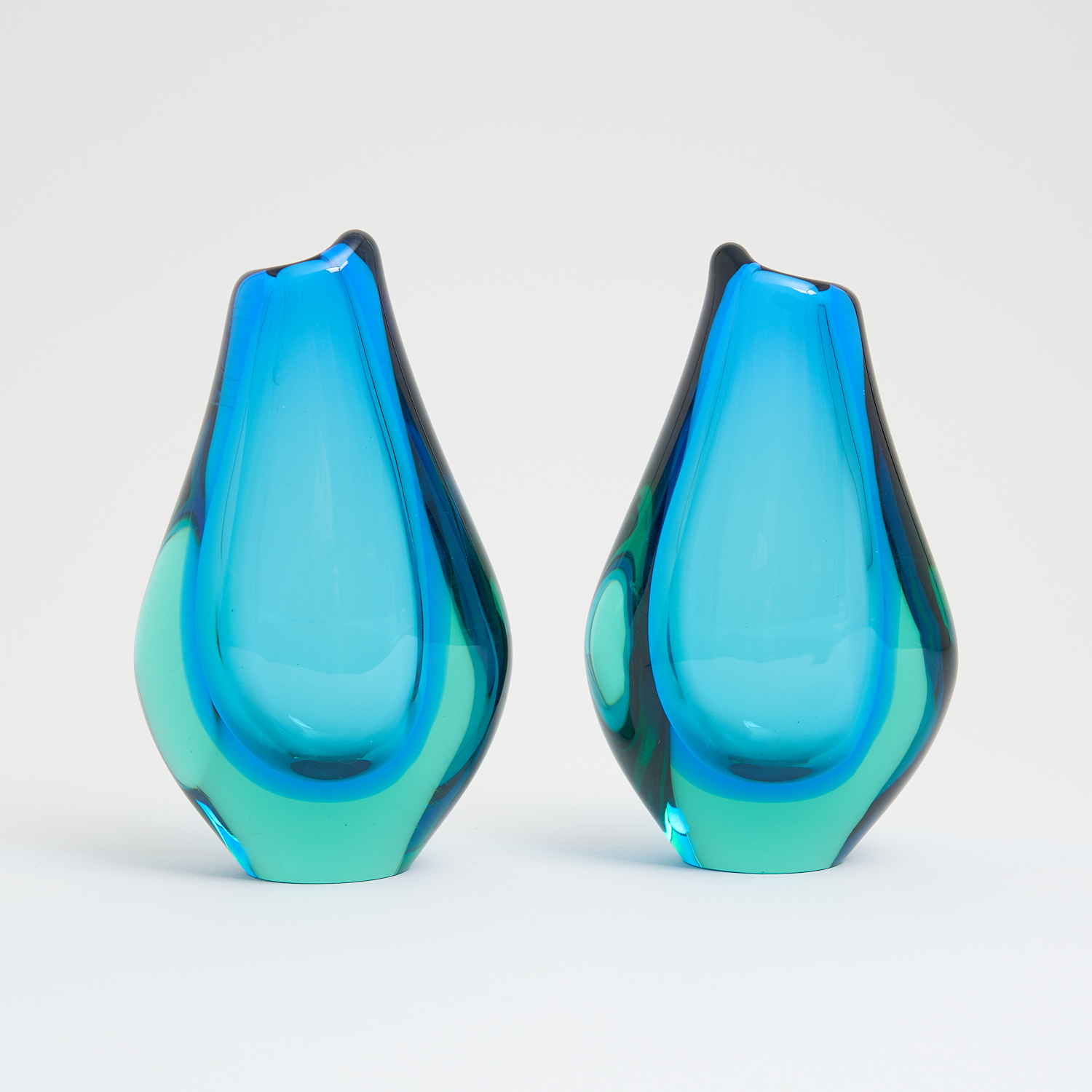 A PAIR OF SMALL SEGUSO STYLE CASED GREEN AND BLUE VASES H.13.5CM