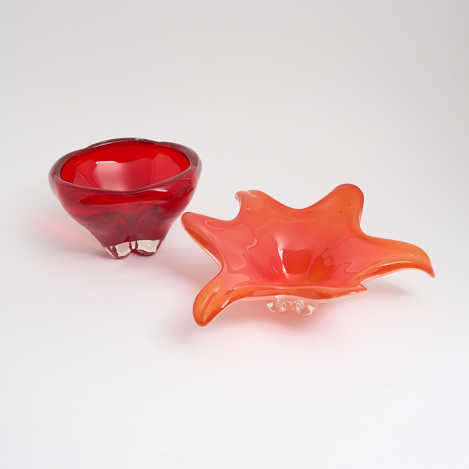A RUBY RED GLASS BOWL TOGETHER WITH AN ORANGE STAR SHAPED BOWL DIA.34CM