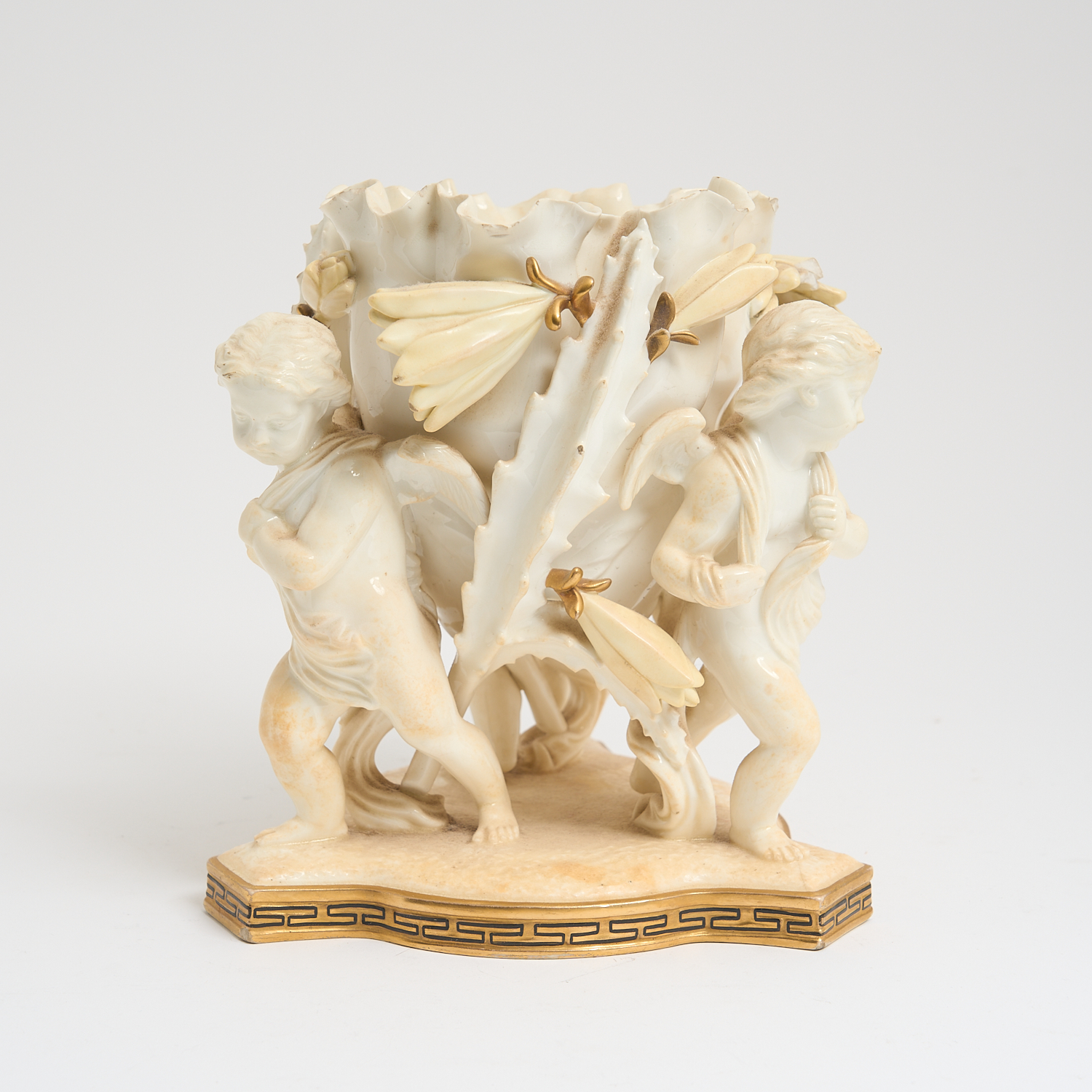 A MOORE BROTHERS CENTREPIECE VASE WITH THREE CHERUBS (A/F) H.20CM