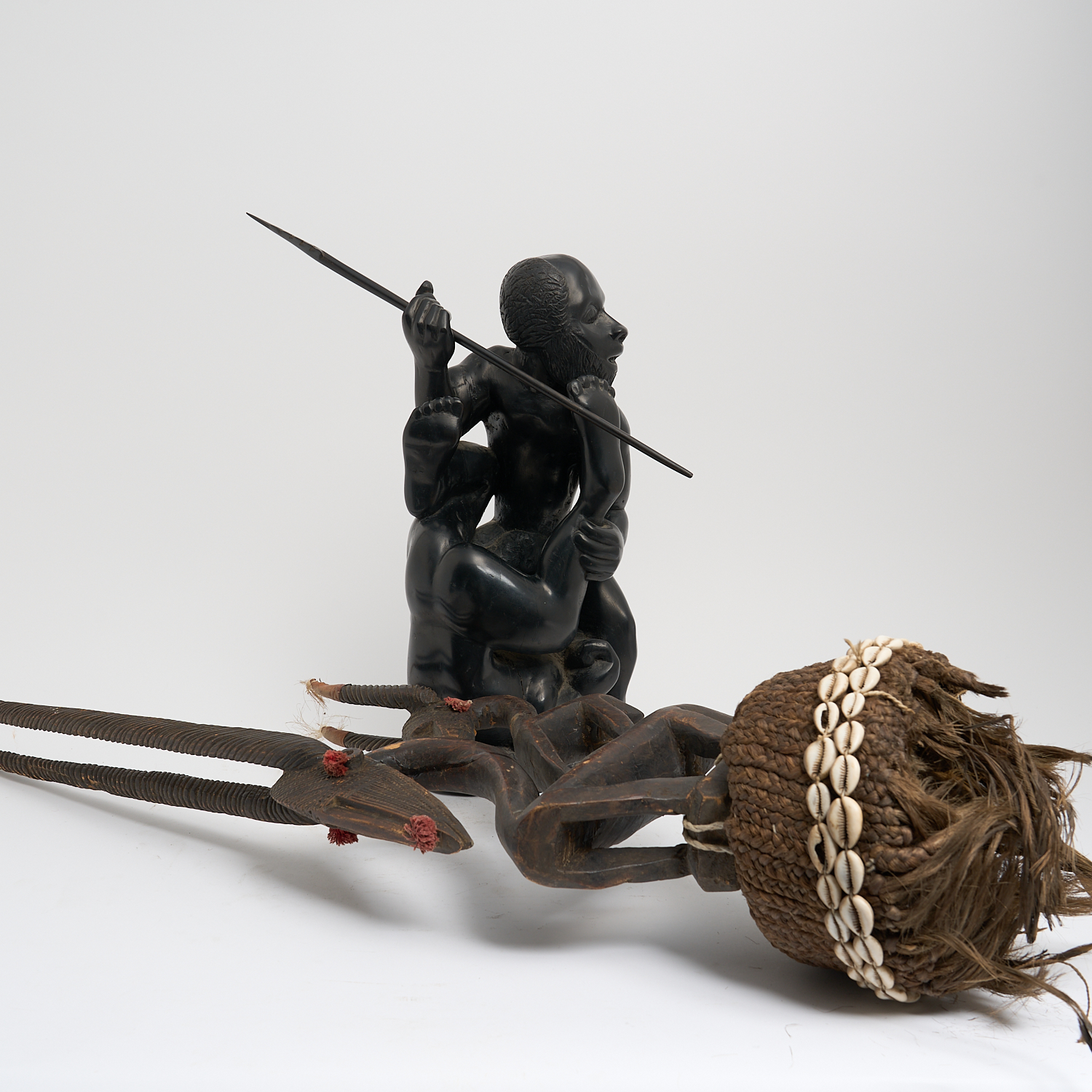 AN AFRICAN EBONISED FIGURAL SCULPTURE TOGETHER WITH AN AFRICAN FEATHERED TRIBAL ANTELOPE FORM HEADPIECE H.90CM