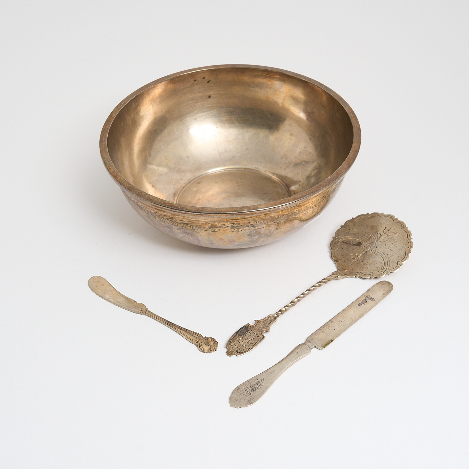 A STERLING SILVER BOWL TOGETHER WITH THREE OTHER PIECES OF FLATWARE 368G DIA.23CM