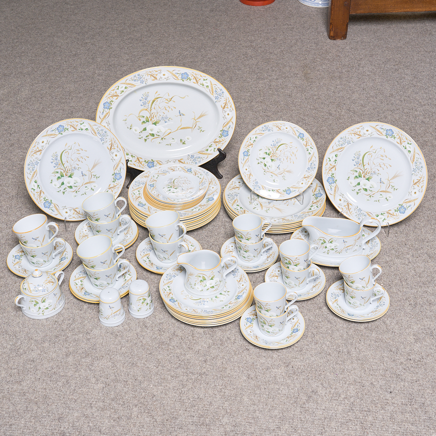 A SPODE SUMMER HARVEST PATTERN SERVICE FOR EIGHT COMPRISING 8 DINNER PLATES, 8 SOUP PLATES, 8 BREAD AND BUTTER PLATES, 8 ENTREE PLATES, 8 COFFEE CUPS AND SAUCERS, 8 TEA CUPS AND SAUCERS, PLUS SALT AND PEPPER SHAKERS, MILK JUG, LIDDED SUGAR BOWL, GRAVY BOAT AND MEAT PLATTER.