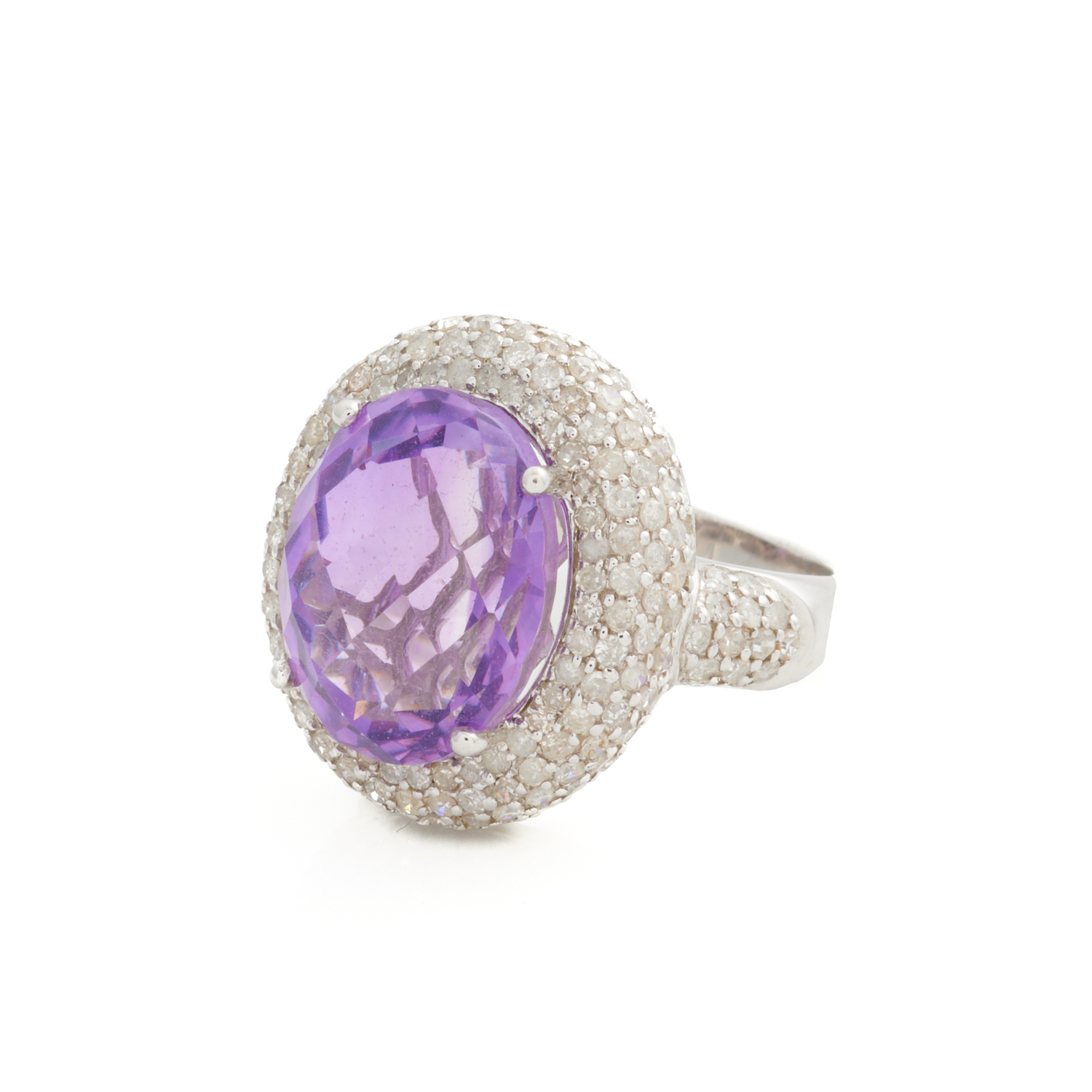 AN AMETHYST AND DIAMOND RING IN 18CT WHITE GOLD, THE AMETHYST MEASURING APPROXIMATELY 14.8 X 12.2MM, SIZE N 1/2, 9.0GMS