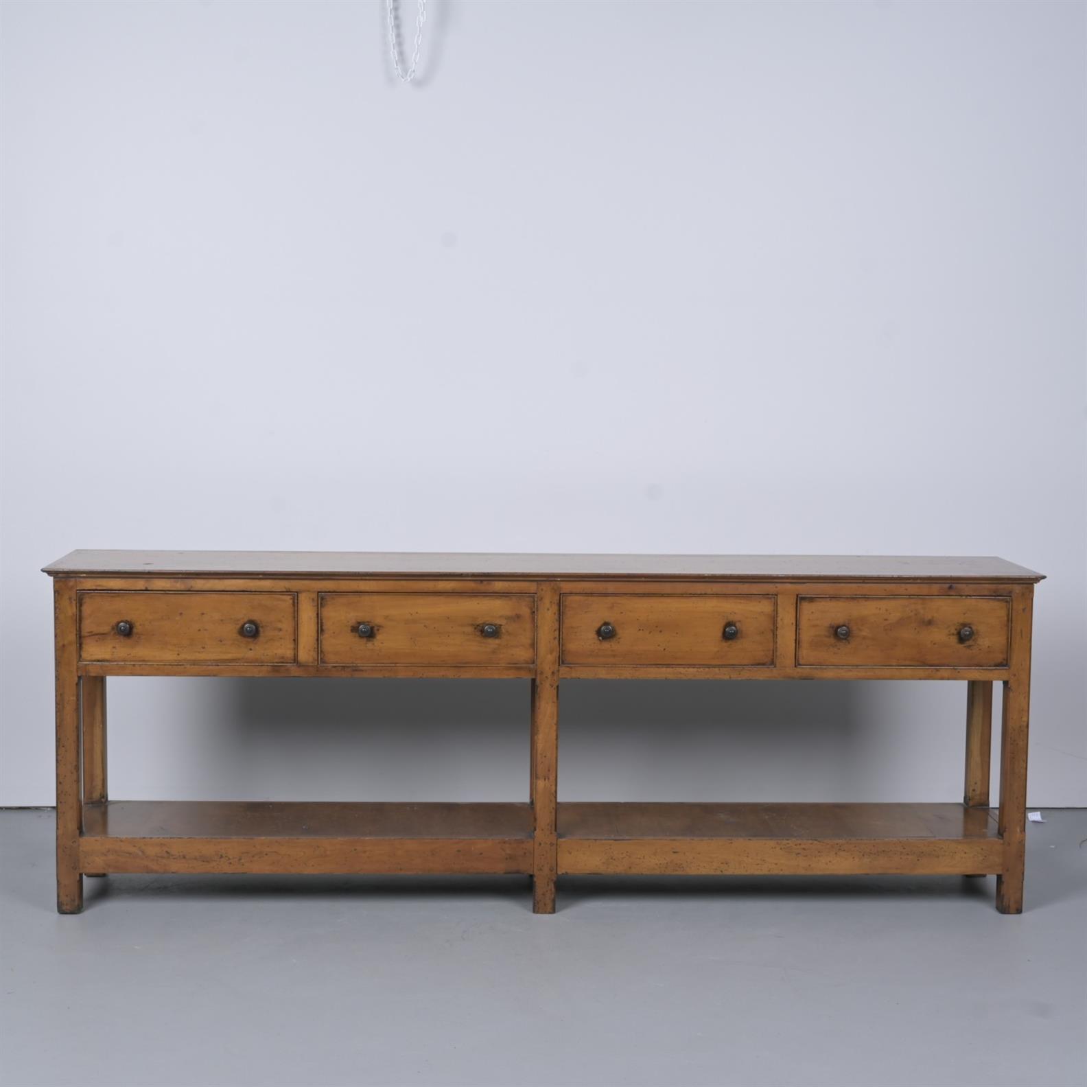 A SUBSTANTIAL OAK CONSOLE WITH FOUR DRAWERS AND POT SHELF (86CM H 244CM W X 45CM D) (THIS ITEM MUST BE REMOVED BY CARRIERS AT THE CUSTOMER'S EXPENSE. LEONARD JOEL STAFF CANNOT ASSIST CARRYING THIS ITEM)