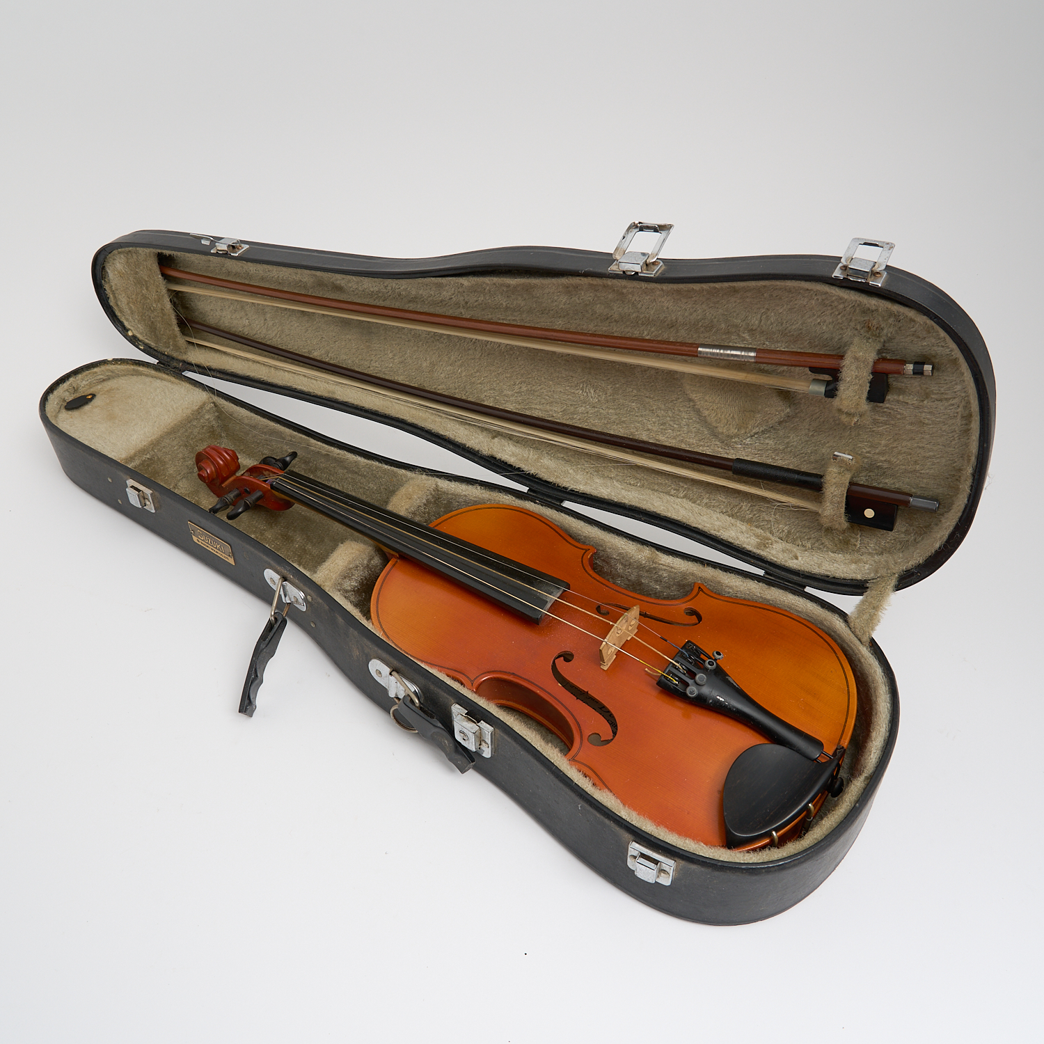 A SUZUKI VIOLIN IN HARD CASE, WITH ADDITIONAL BOW W.72CM