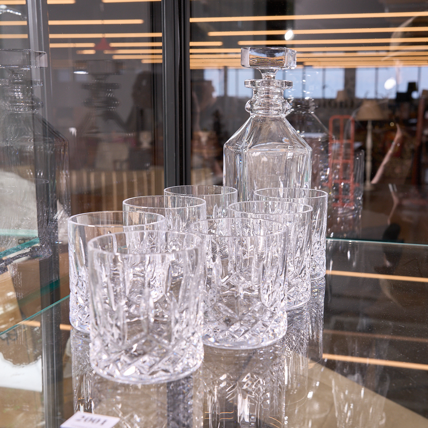 A WATERFORD CRYSTAL LISMORE PATTERN DECANTER SET INCLUDING FLAT TUMBLERS H.22CM (TALLEST)