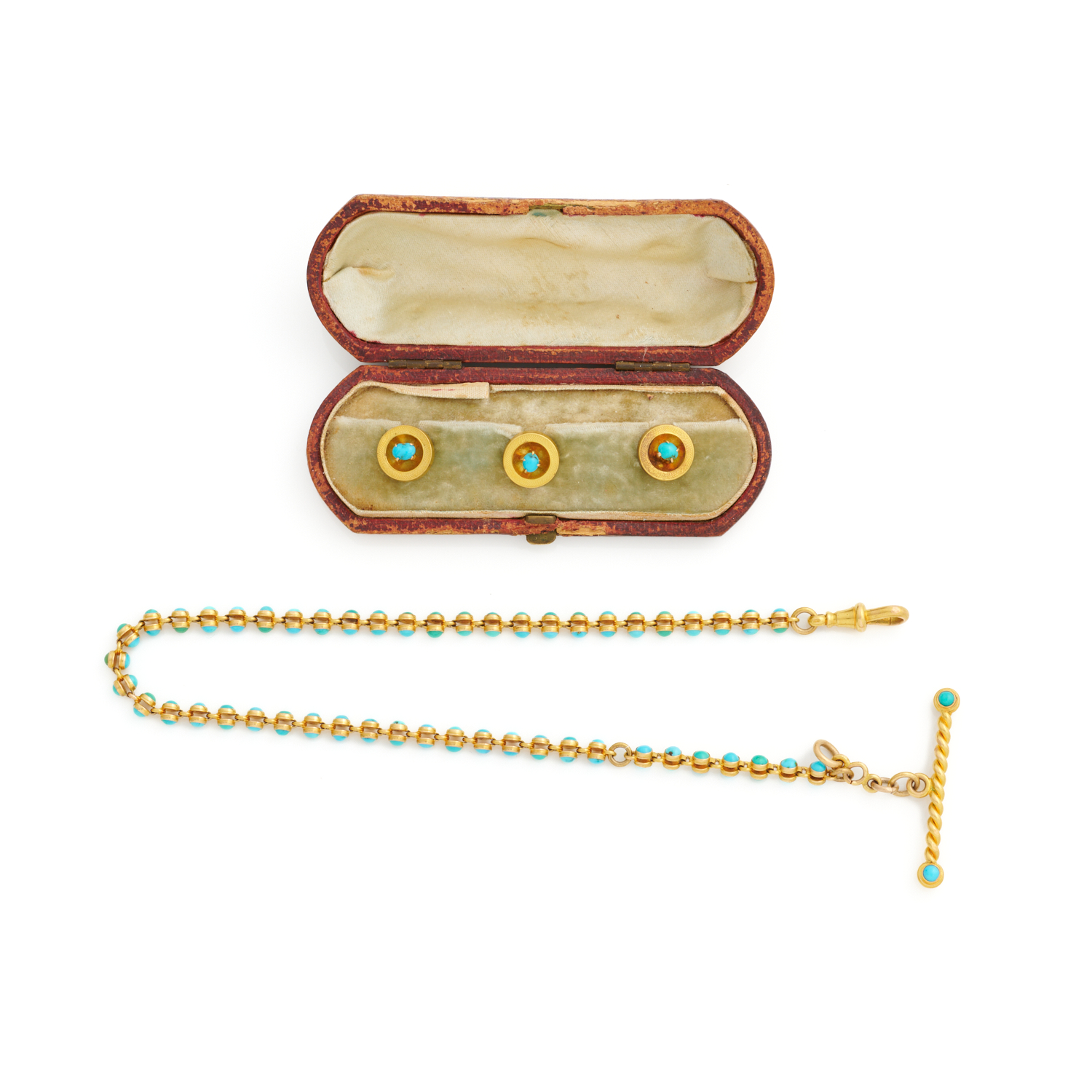 A VINTAGE TURQUOISE SUITE IN 14CT GOLD, COMPRISING A FOB CHAIN TO A T-BAR ATTACHMENT, TOGETHER WITH A BOXED SET OF THREE SHIRT STUDS, FOB CHAIN LENGTH 310MM, TOTAL WEIGHT 23.8GMS