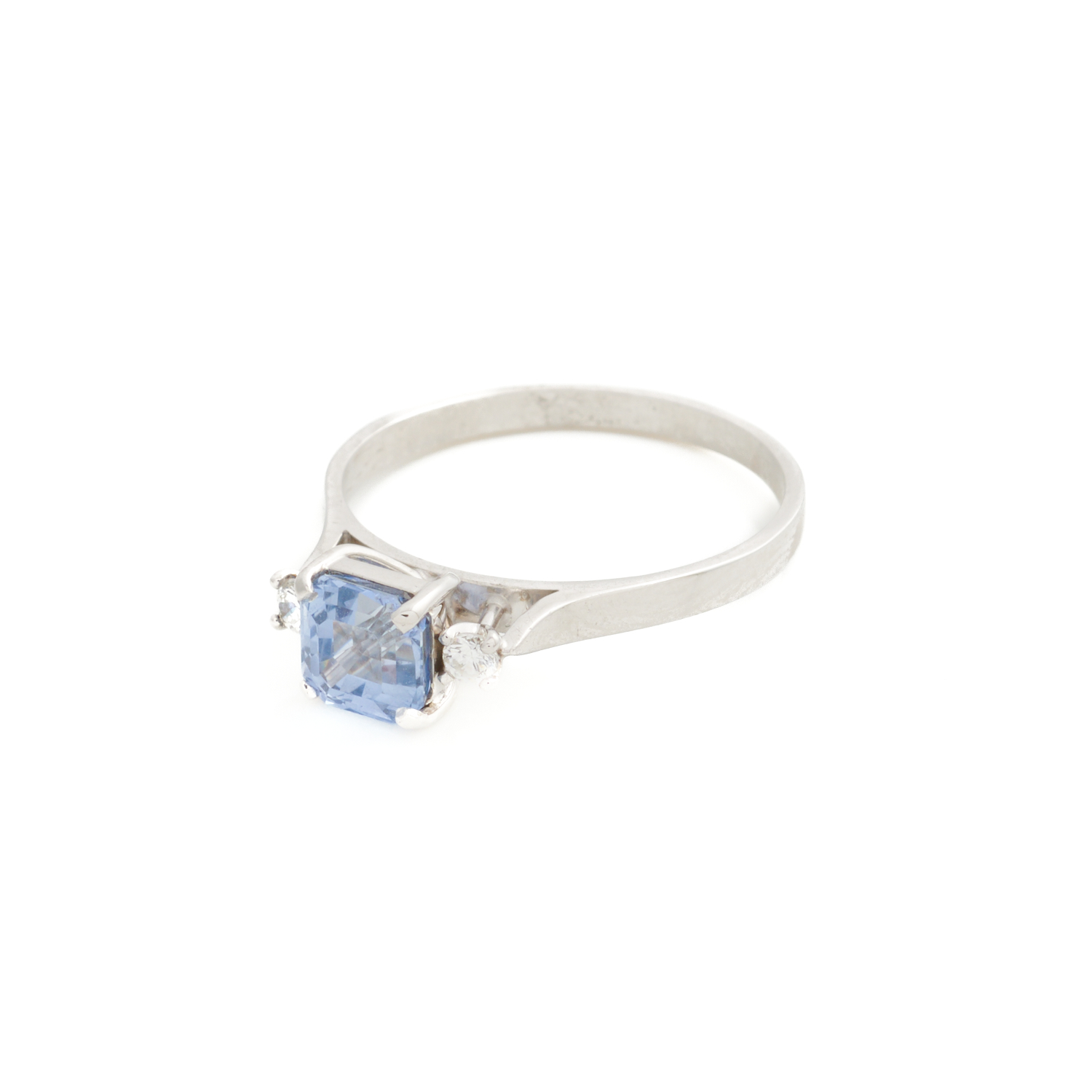 A CEYLONESE SAPPHIRE AND DIAMOND RING IN 18CT WHITE GOLD, THE SAPPHIRE WEIGHING APPROXIMATELY 1.37CTS, SIZE O 1/2, 2.6GMS