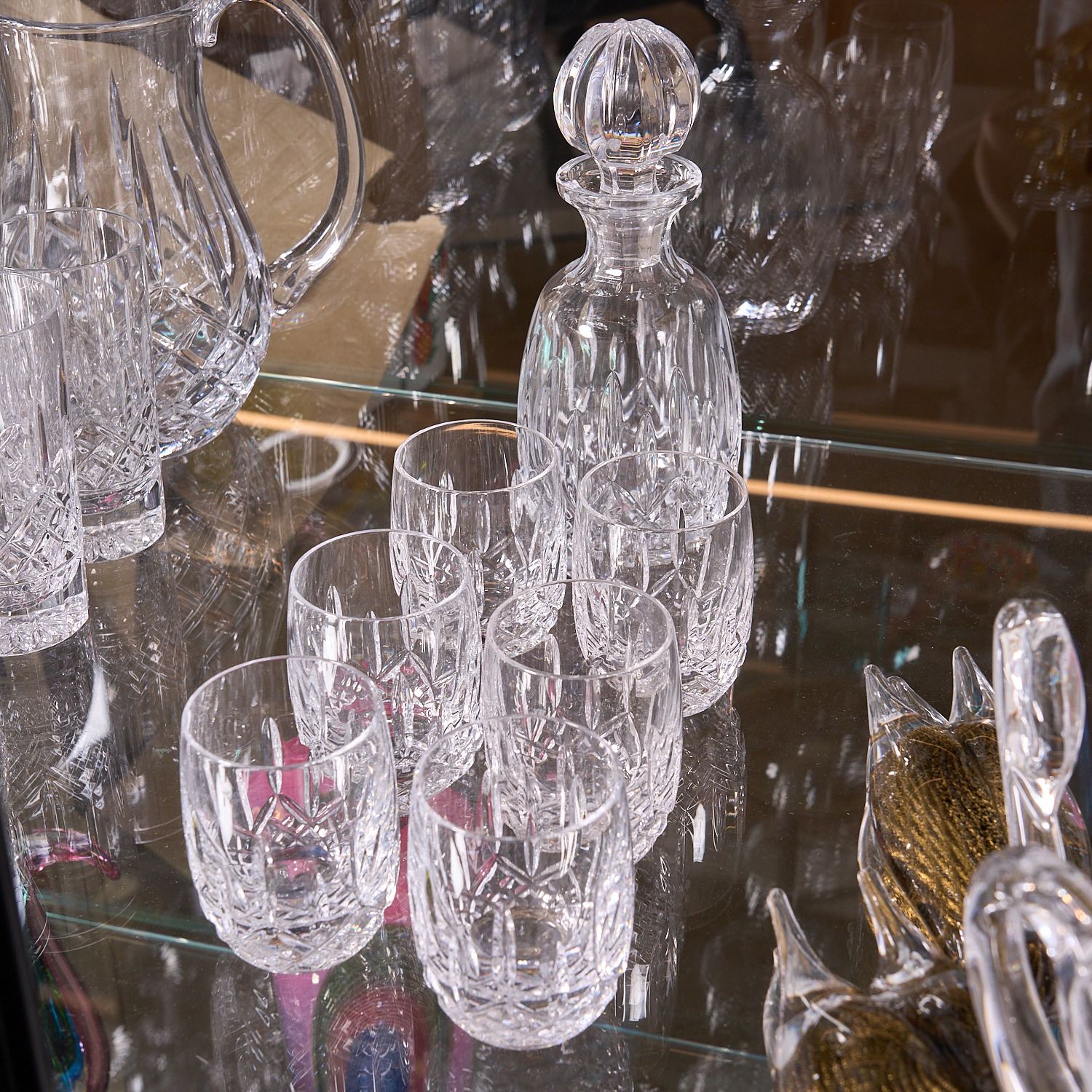 A WATERFORD CRYSTAL LISMORE PATTERN DECANTER SET INCLUDING SIX FLAT TUMBLERS H.24CM