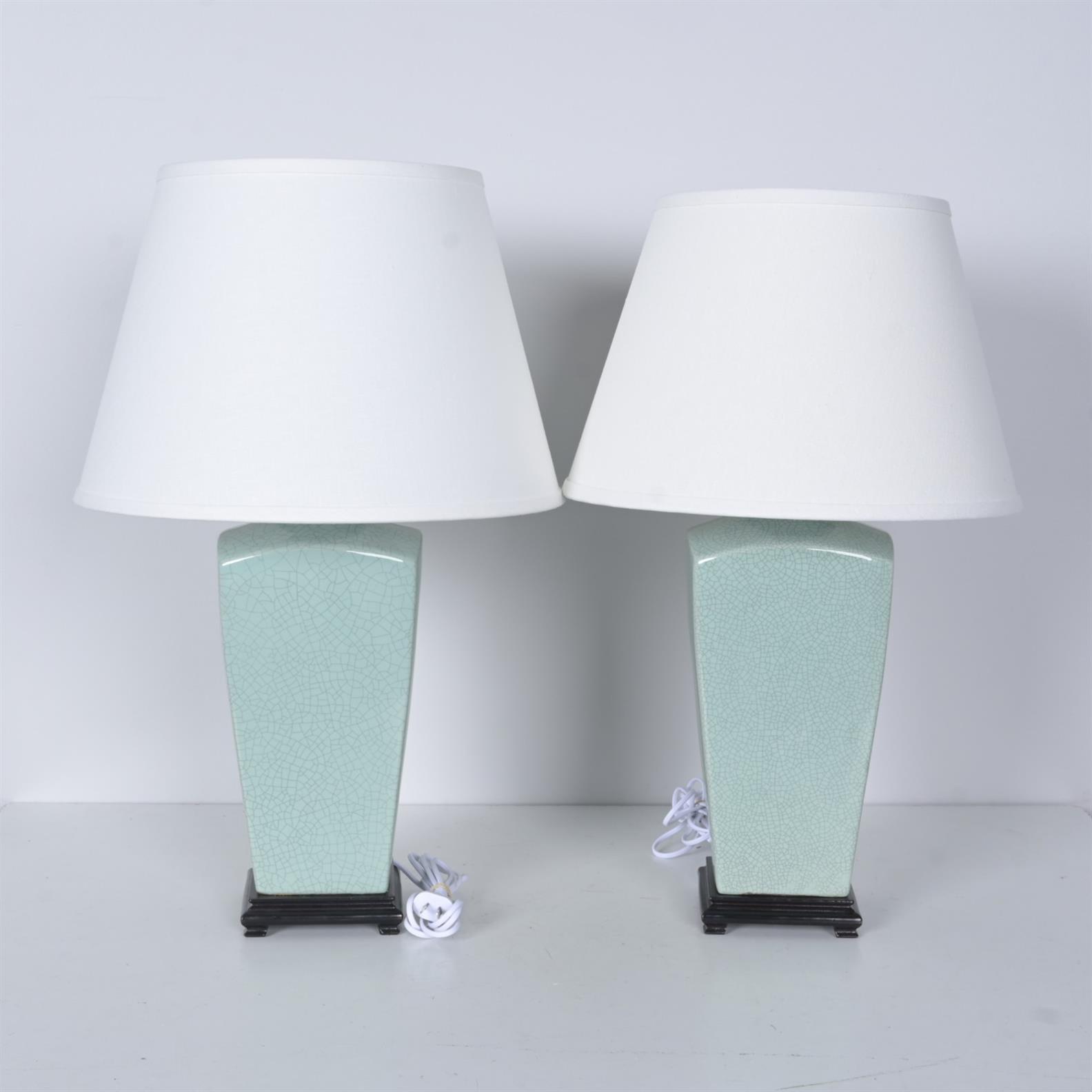 A PAIR OF GREEN GLAZED CERAMIC TABLE LAMPS (65CM H X 44CM DIA)