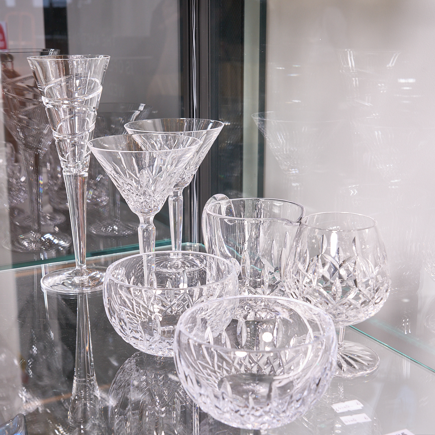 A COLLECTION OF WATERFORD CRYSTAL LISMORE PATTERN INCLUDING TWO MARTINI GLASSES, A BRANDY, TWO BOWLS, A JUG, TOGETHER WITH A JASPER CONRAN FOR STUART CRYSTAL CHAMPAGNE H.26CM (TALLEST)