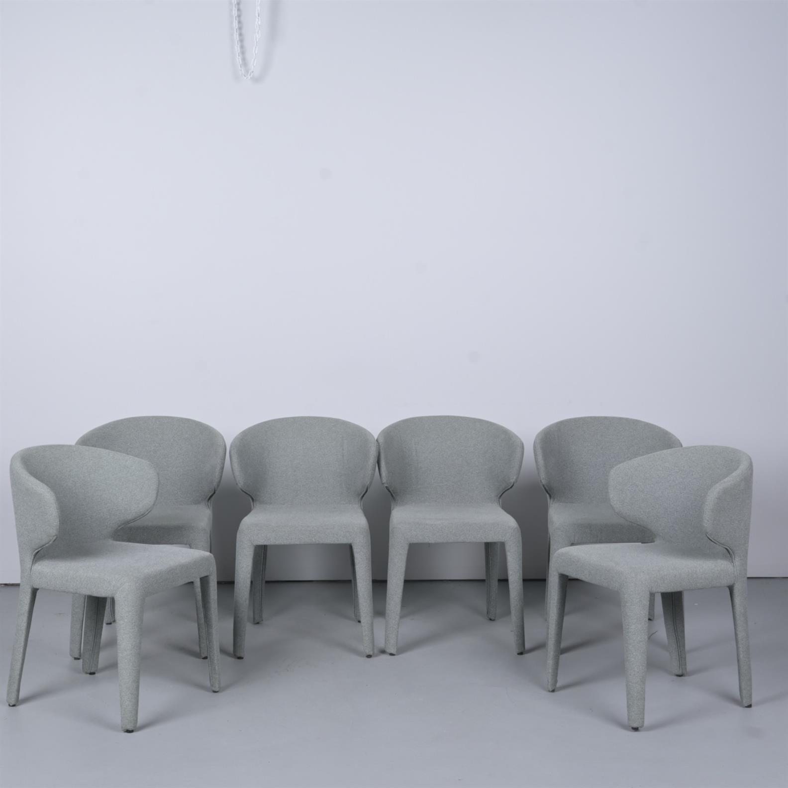 A SET OF SIX CONTEMPORARY UPHOLSTERED DINING CHAIRS (81CM H X 56CM W X 58CM D)