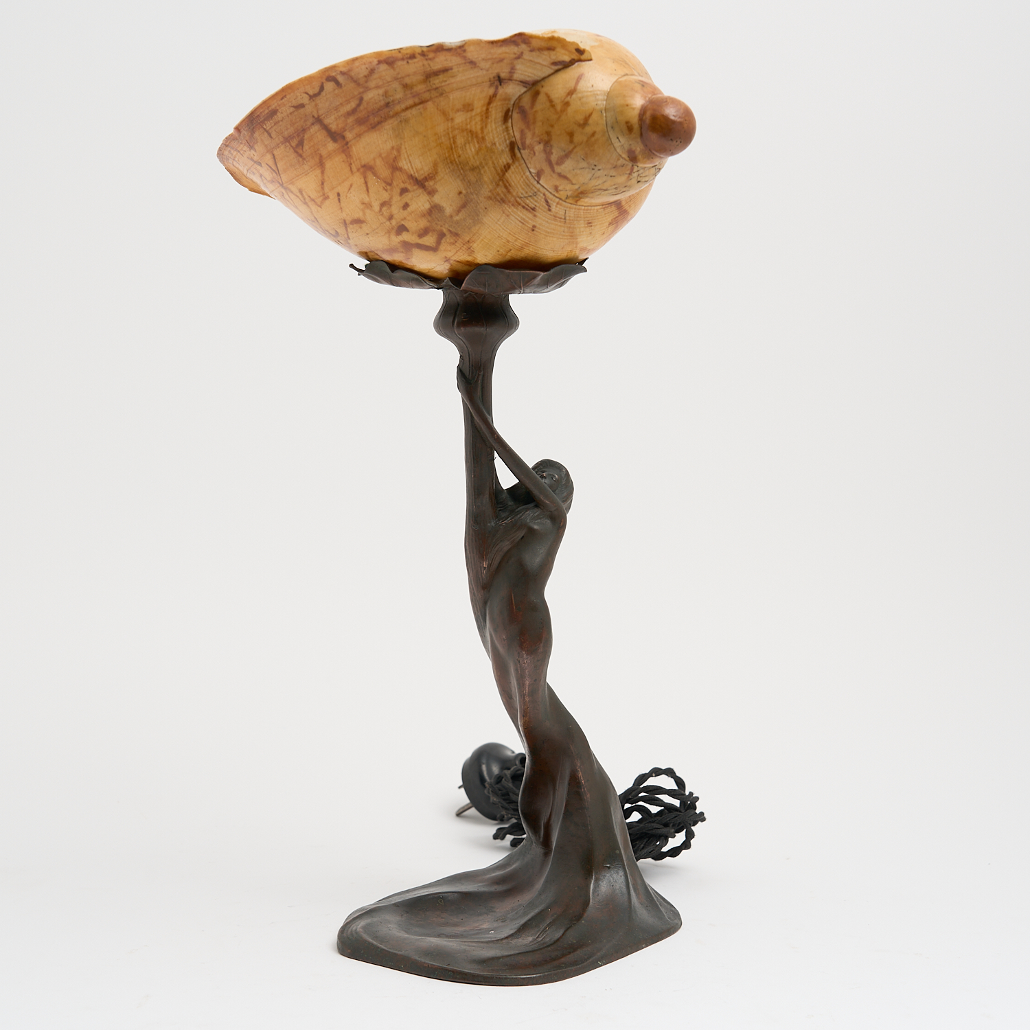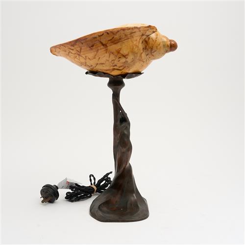 AN ART NOUVEAU BRONZE MAIDEN LAMP WITH ORIGINAL SHELL SHADE H.35CM