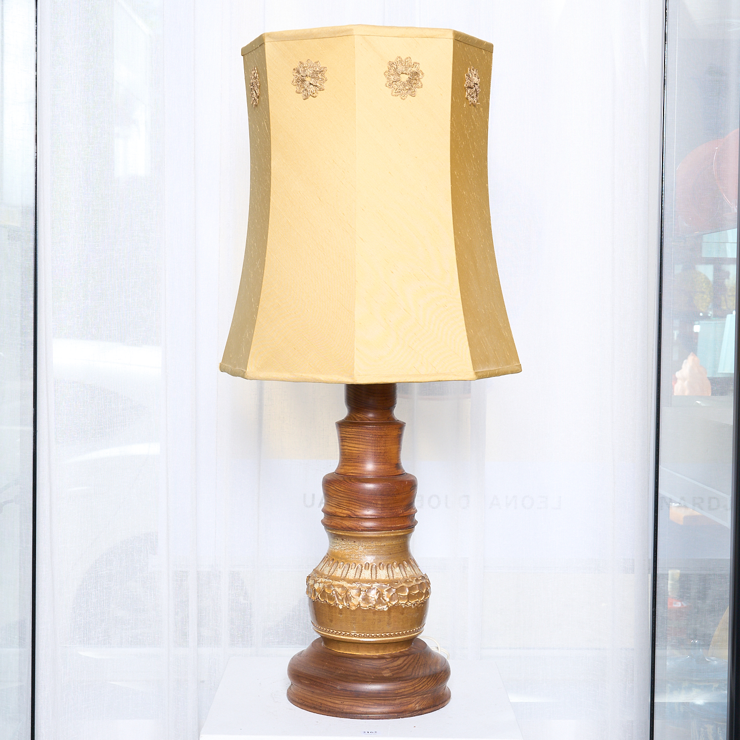 AN AUSTRALIAN MADE SOLID BLACKWOOD MOUNTED CERAMIC CENTRE TABLE LAMP WITH ORIGINAL SILK SHADE H.86CM