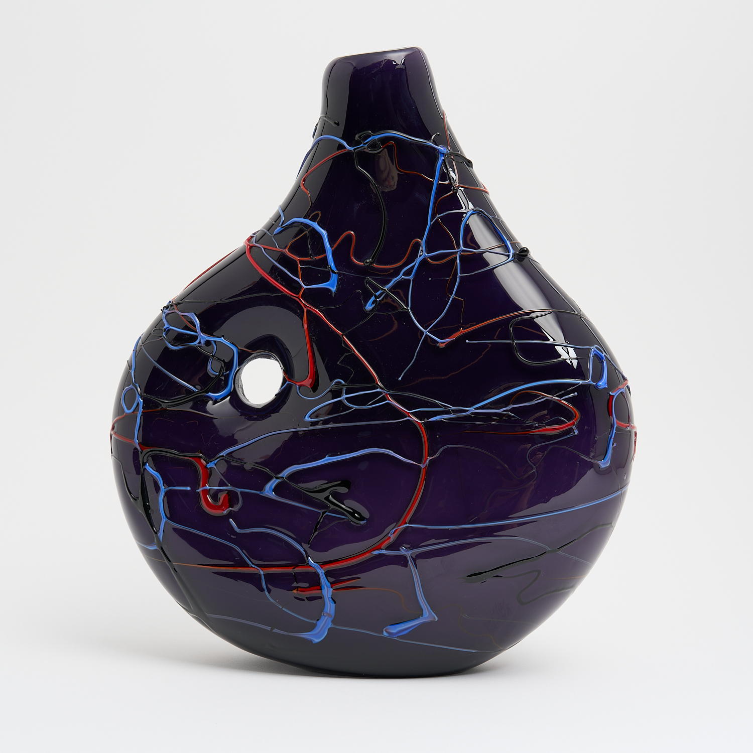 A LARGE HANDMADE ART GLASS VASE IN PURPLE WITH RED AND BLUE TRAILING H.35CM