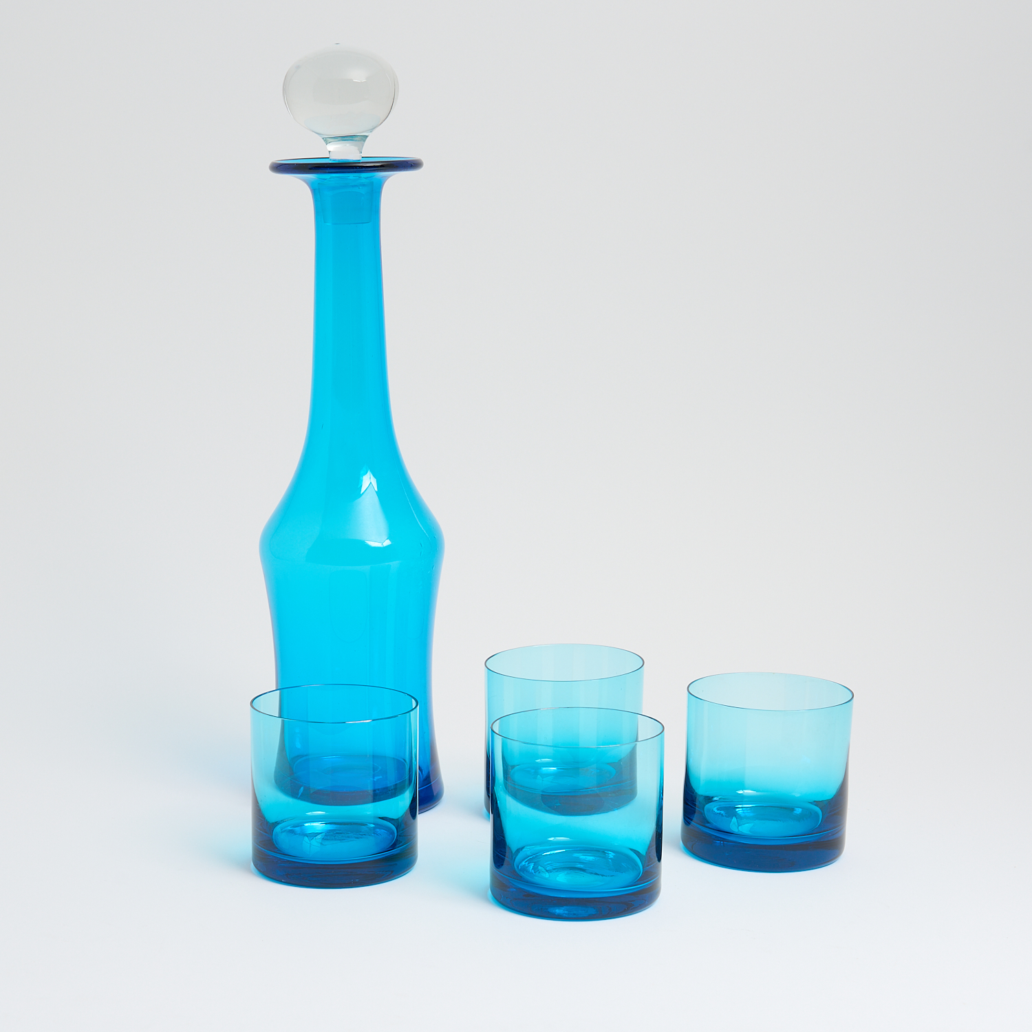 A RETRO FIVE PIECE BLUE GLASS DECANTER AND TUMBLER SET H.41CM