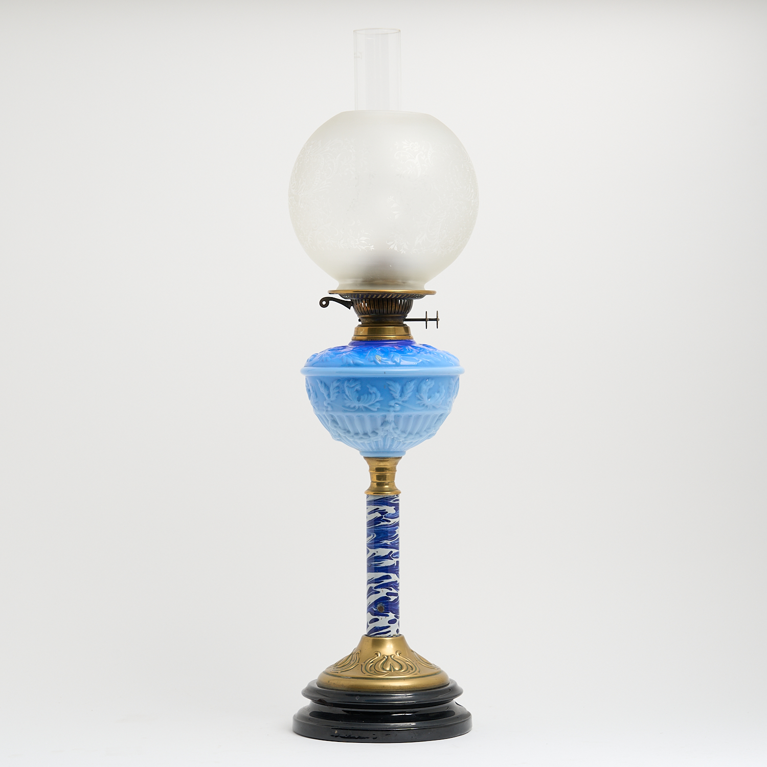 AN ENGLISH BRASS AND CERAMIC BASED GLASS FONT DOUBLE BURNER KEROSENE LAMP WITH FLUE AND SHADE H.72CM
