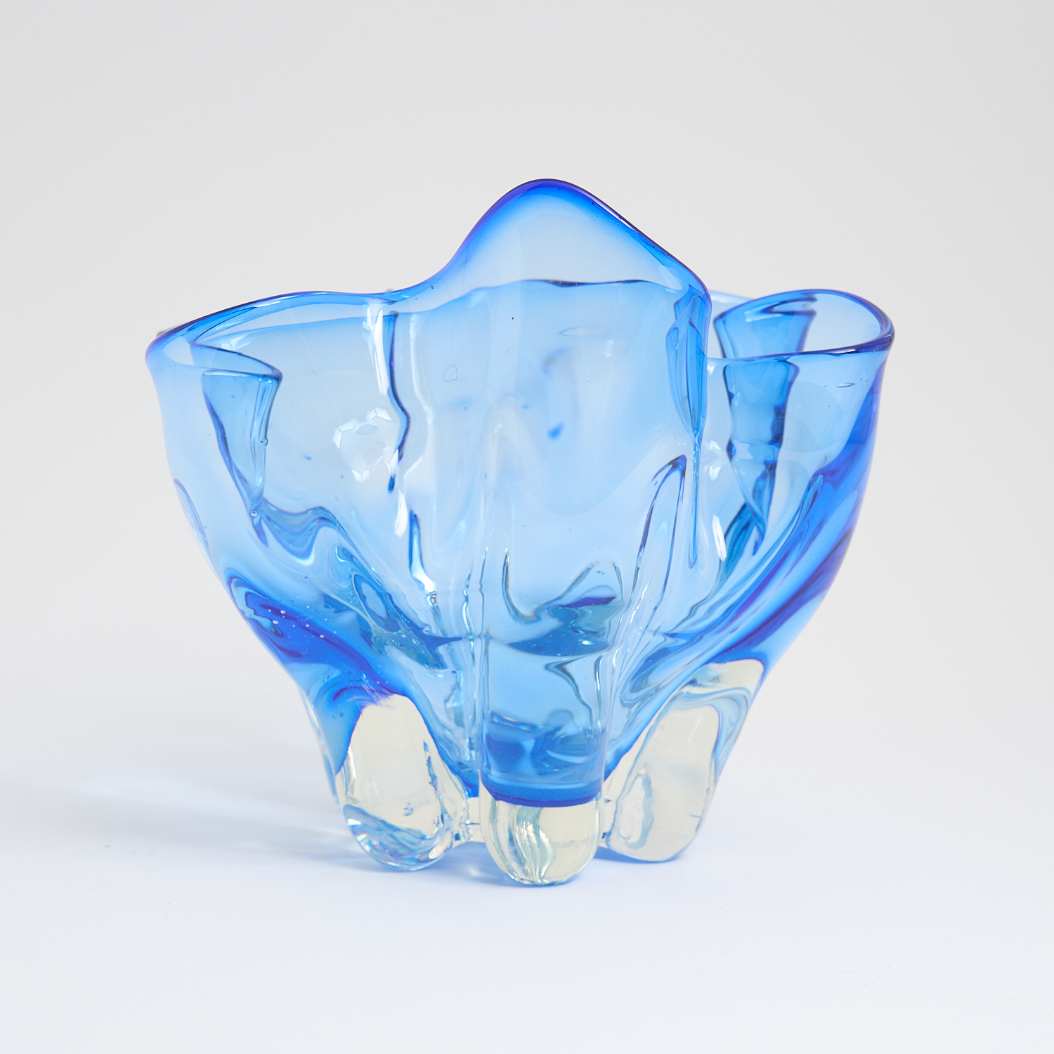 A LARGE BLUE AND CLEAR GLASS ORGANIC FORM CENTRE BOWL W.25CM