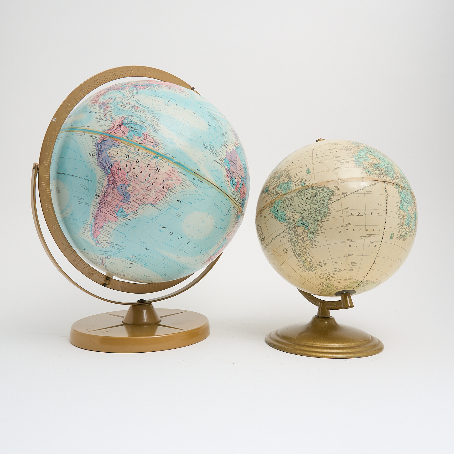 TWO VINTAGE WORLD GLOBES INCLUDING A 12 INCH REPLOGUE AND AN 8 INCH CRAMS H.44CM (TALLEST)