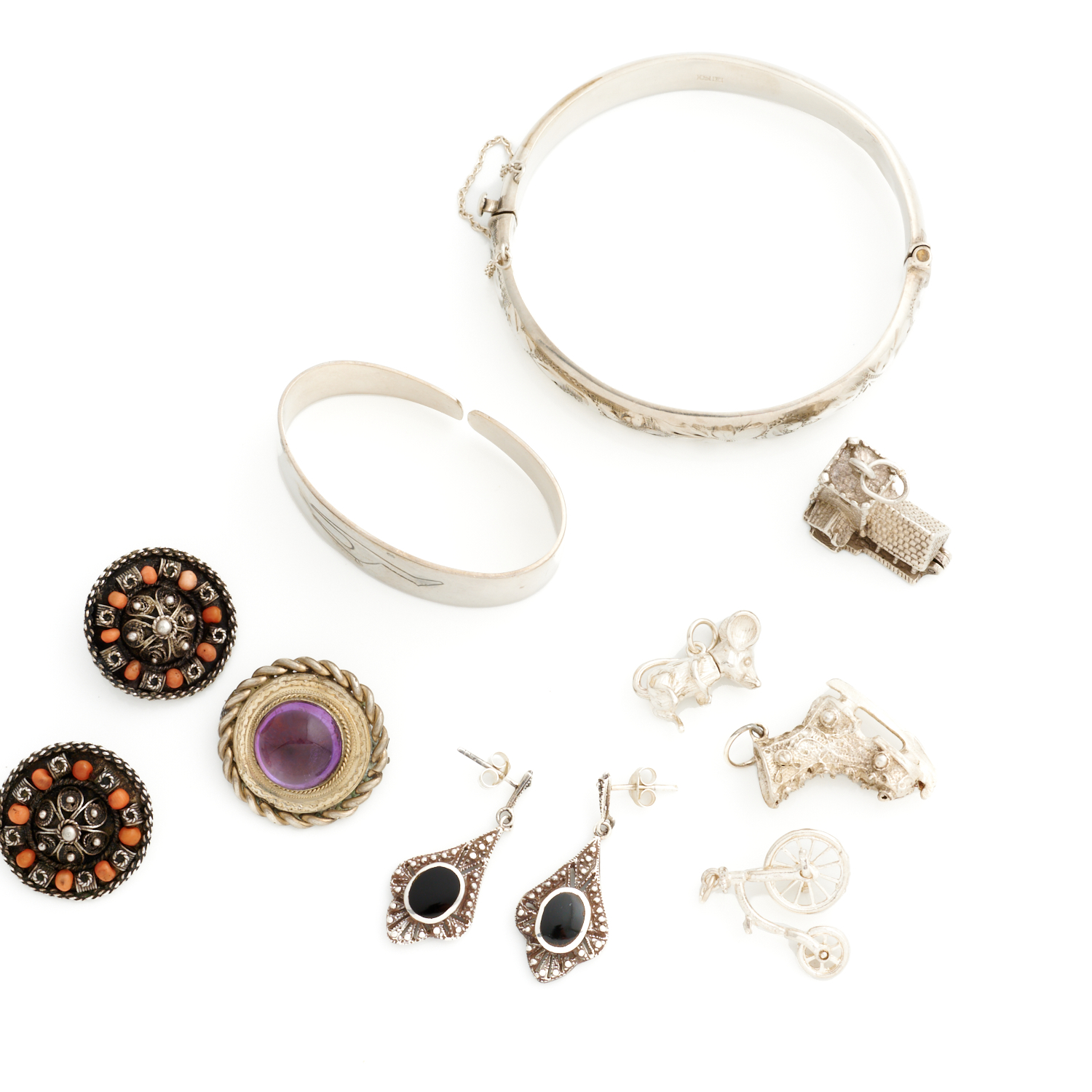 A COLLECTION OF VINTAGE SILVER JEWELLERY, COMPRISING A BANGLE, TWO PAIRS OF EARRINGS AND A BROOCH