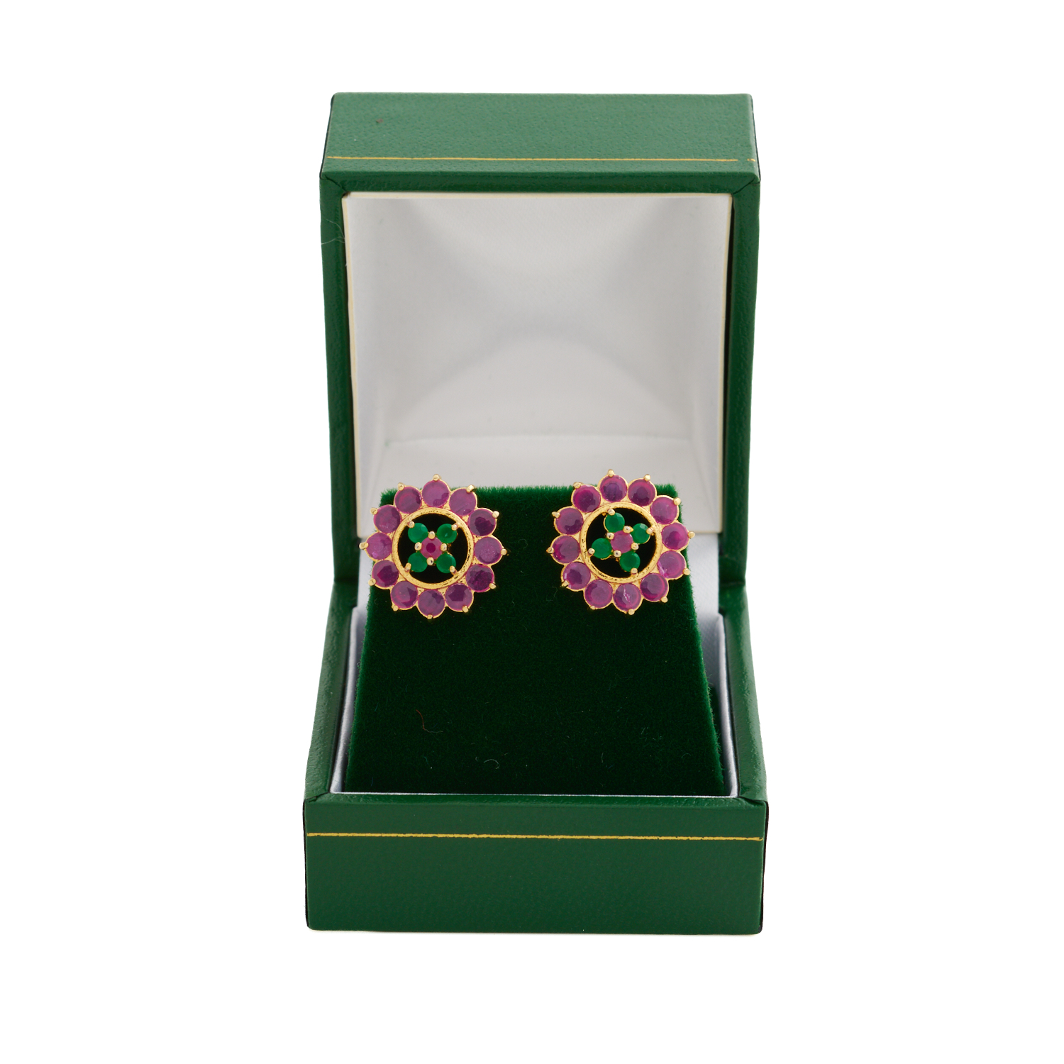 A PAIR OF EMERALD AND RUBY STUDS IN SILVER GILT TO POST AND BARREL FITTINGS, 2MM X 20MM, ACCOMPANIED BY A BOX