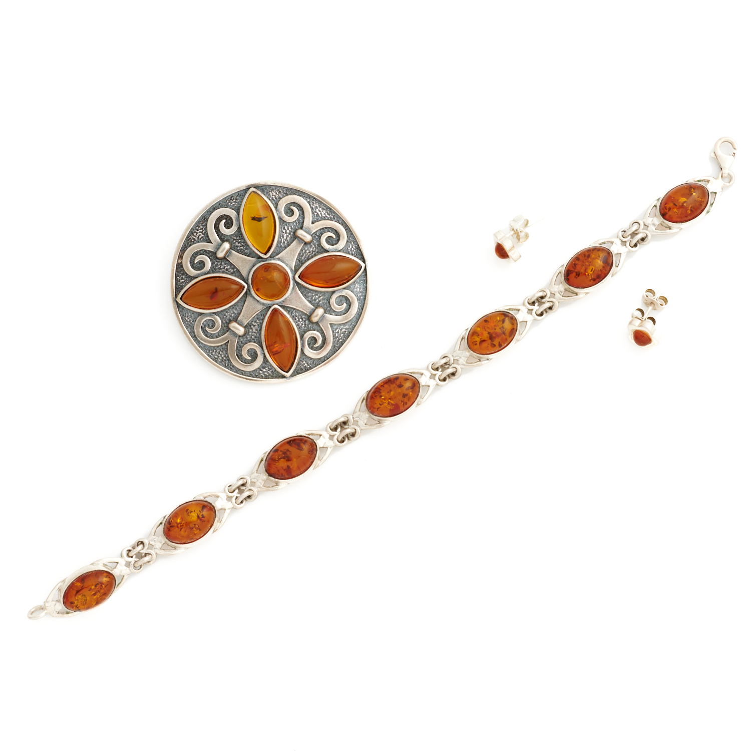 A COLLECTION OF VINTAGE AMBER JEWELLERY IN SILVER, COMPRISING A BRACELET, A PAIR OF EARRINGS AND A BROOCH, THE BROOCH MEASURING 43MM