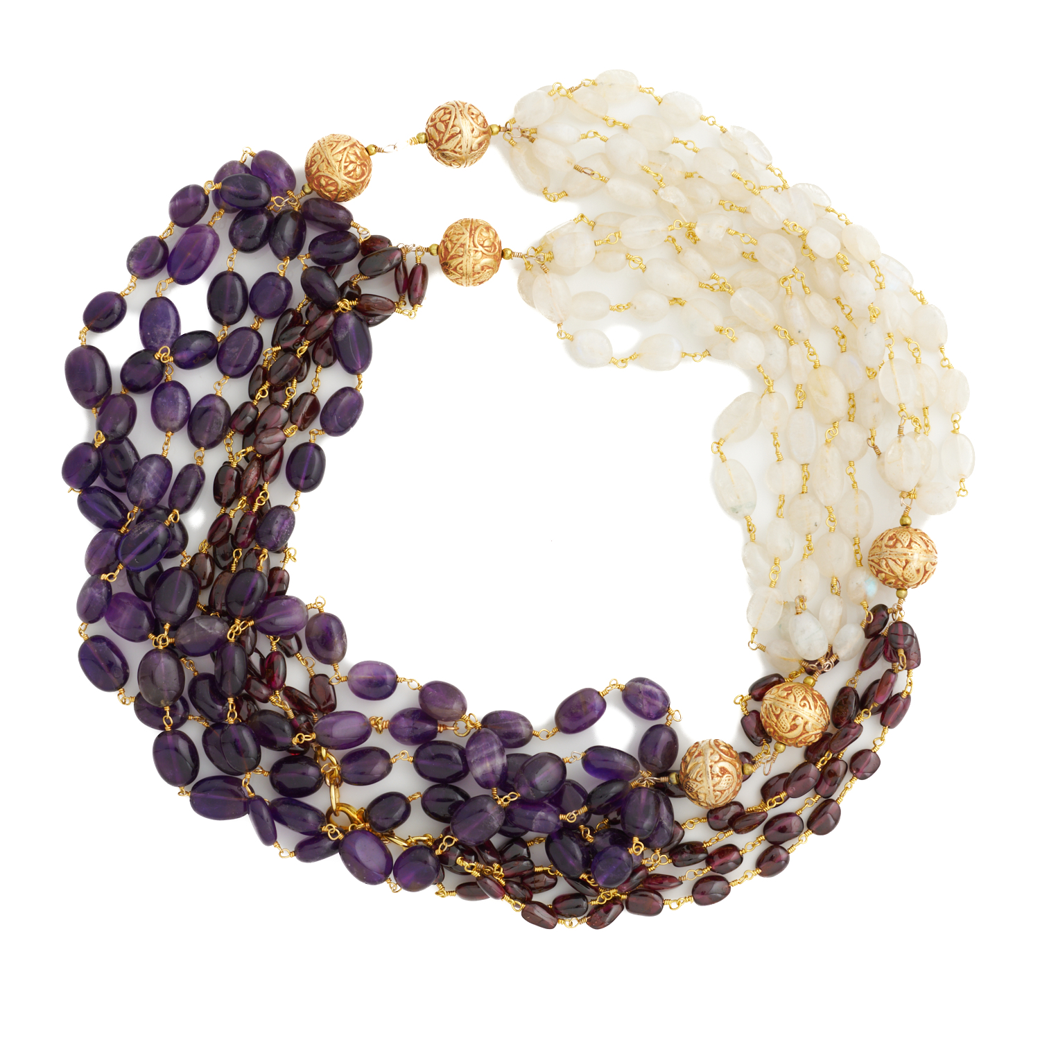 A MULTI STRAND NECKLACE OF AMETHYST, GARNET AND MOONSTONE BEADS IN SILVER GILT, 880MM