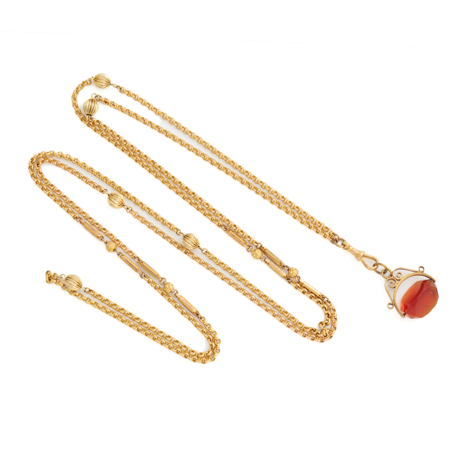 A SPINNER PASTE FOB PENDANT TO A VICTORIAN FANCY LINK GUARD CHAIN IN GOLD PLATE, PENDANT LENGTH 30MM, 1460MM