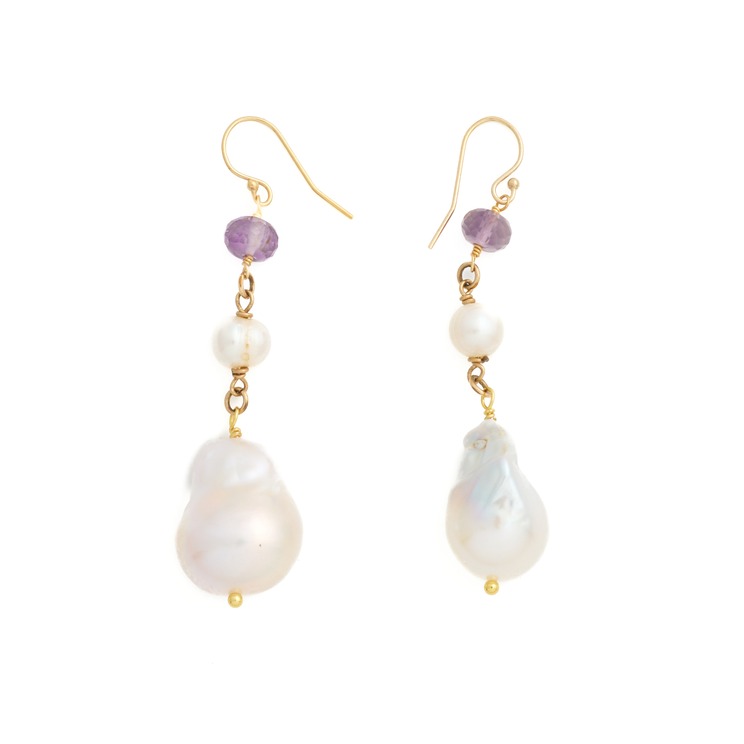 A PAIR OF BAROQUE PEARL AND AMETHYST EARRINGS IN GILT TO SHEPHERD HOOK FITTINGS, 60MM