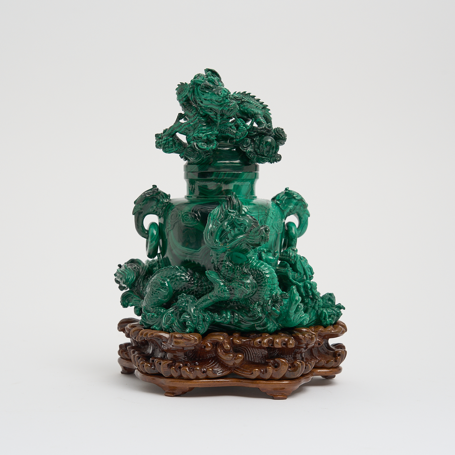 A CHINESE CARVED MALACHITE URN AND COVER ADORNED WITH DRAGONS, CARVED HARDWOOD STAND WITH DISPLAY BOX H.24CM (TOTAL HEIGHT) (A/F)