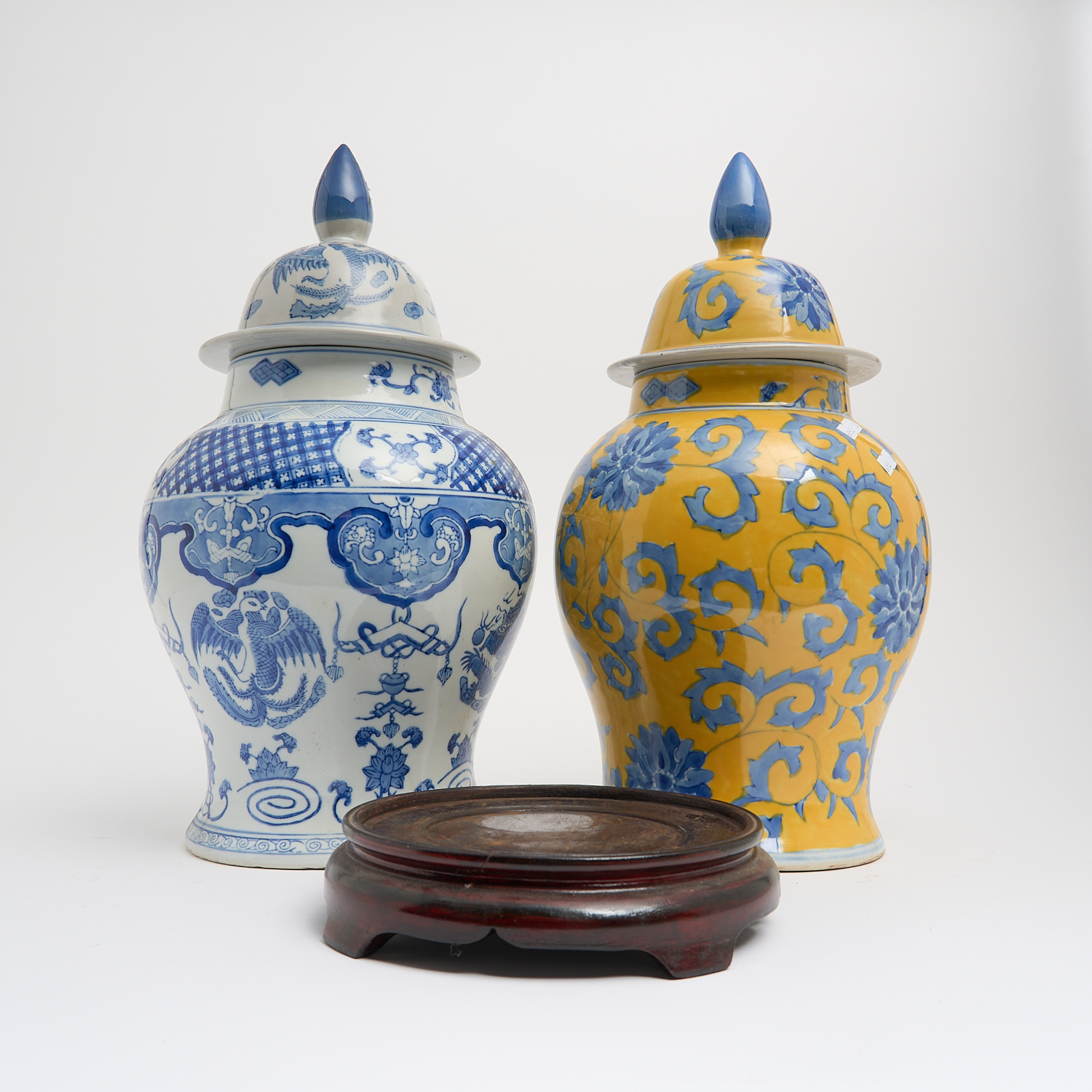 TWO LARGE CHINESE PORCELAIN URNS WITH COVERS, ONE YELLOW AND BLUE, THE OTHER IN BLUE AND WHITE H.43CM